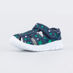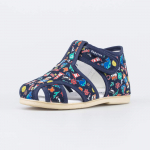 Синие текстильные туфельки, по всей поверхности украшенные принтом, подходят для мальчика ясельного возраста.