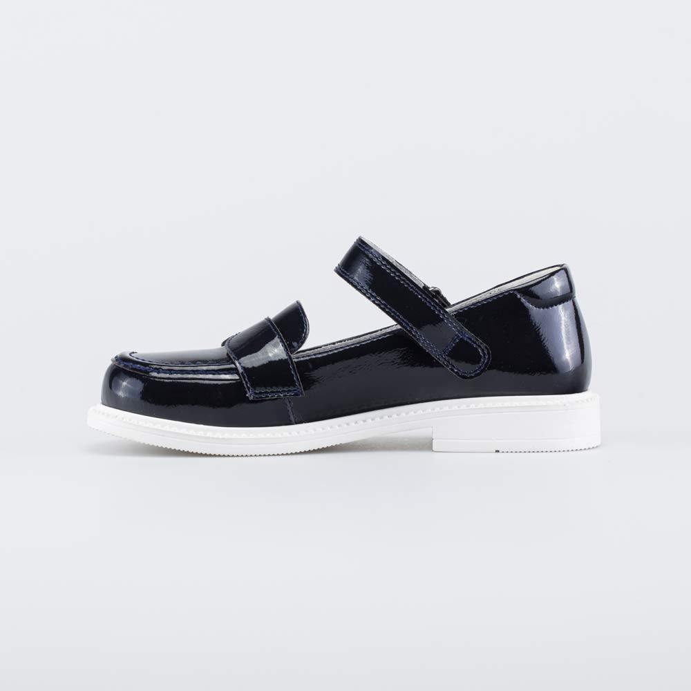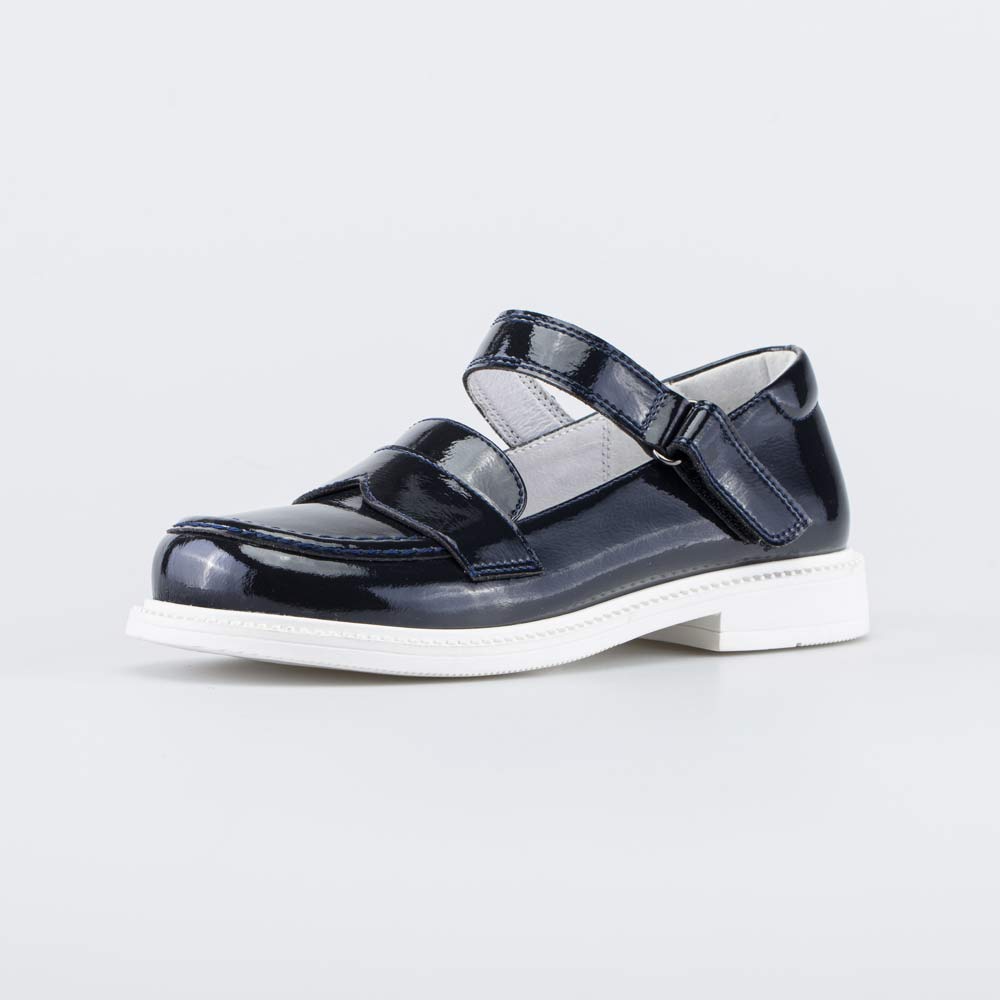 Верх выполнен из гипоаллергенной и дышащей натуральной кожи с лаковым покрытием, которое делает школьные туфли заметной деталью образа. Подкладка и стелька темно-синих туфель выполнены из белой натуральной кожи – не придется переживать, что школьная обувь окрасит носочки или колготки.