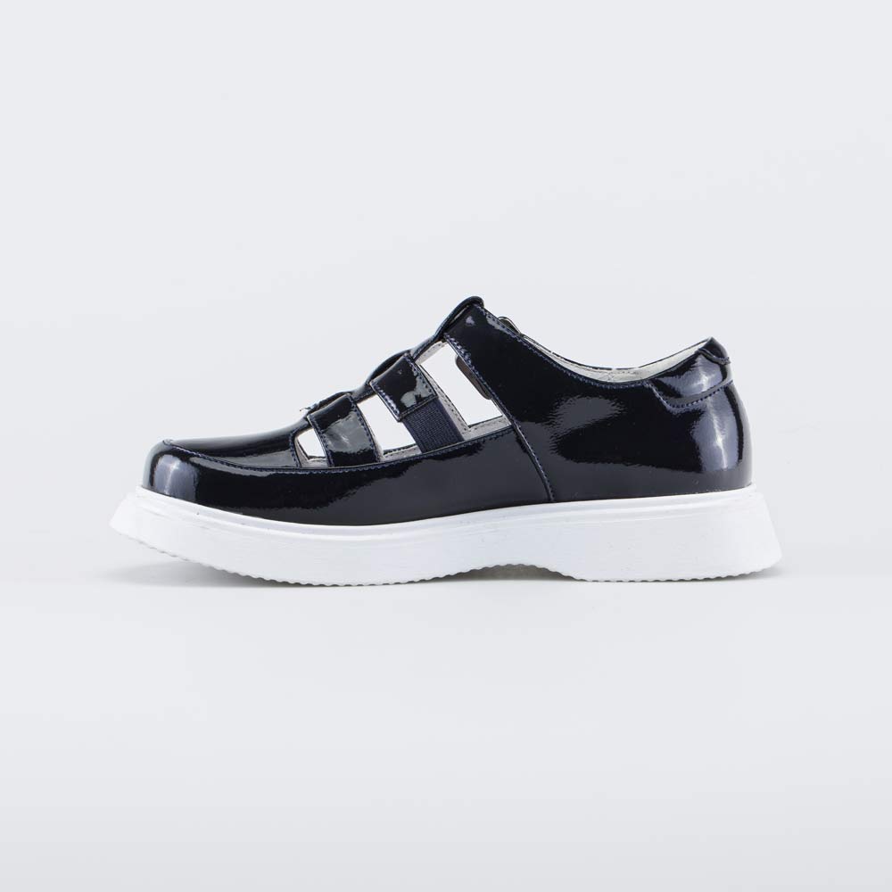 Верх, подкладка и стелька синих туфель выполнены из гипоаллергенной и дышащей натуральной кожи, что обеспечивает максимально комфортный микроклимат внутри школьной обуви. А глянцевое лаковое покрытие делает модель заметной деталью образа.