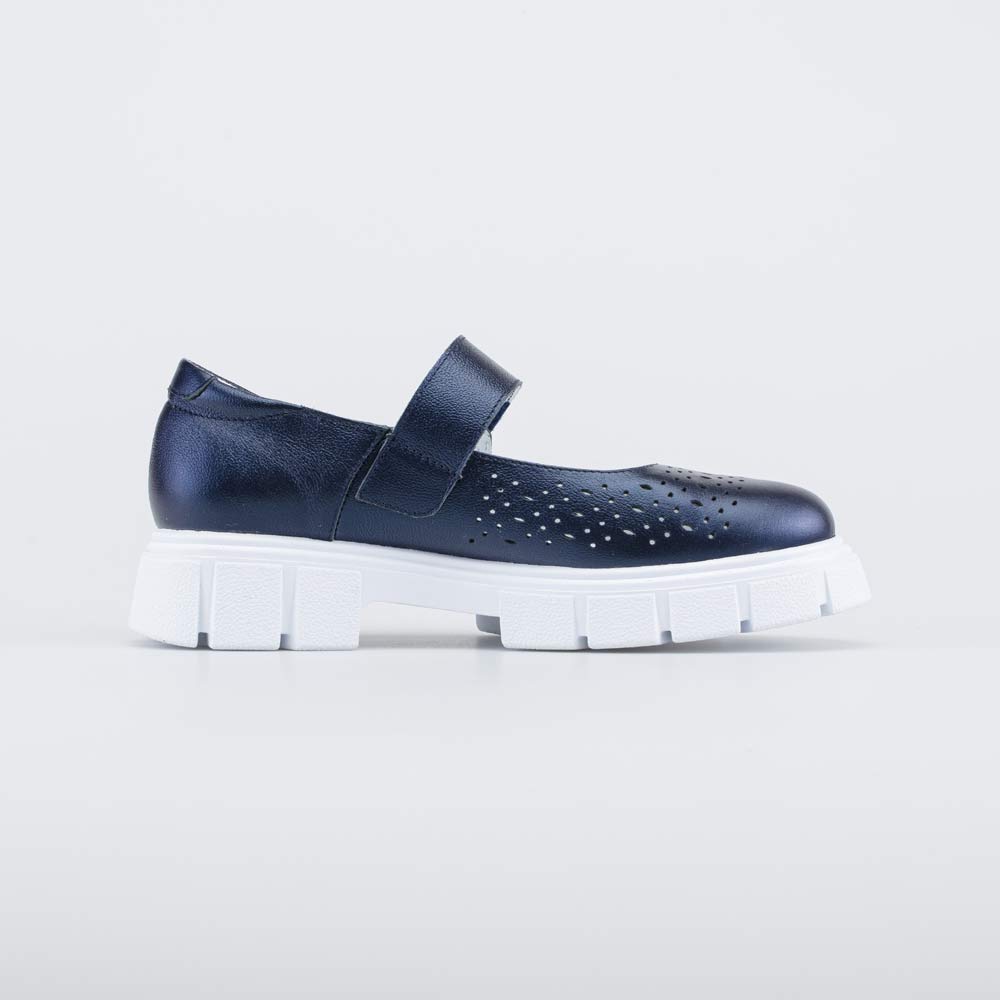 Синие кожаные туфли на белой подошве подходят для девочки-подростка.