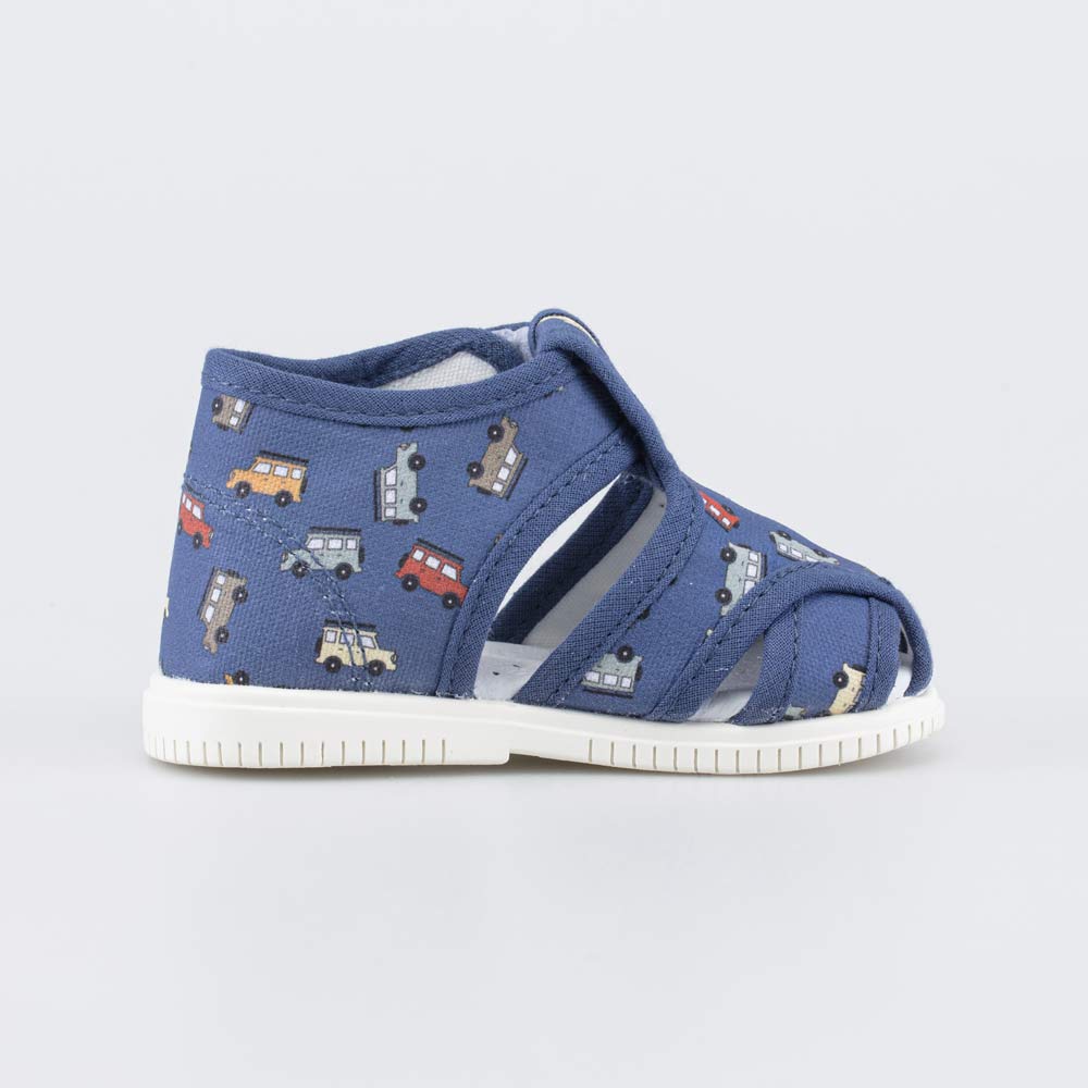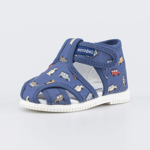 Текстильные сандалии, по всей поверхности украшенные принтом, подходят для мальчика, который только начинает ходить.