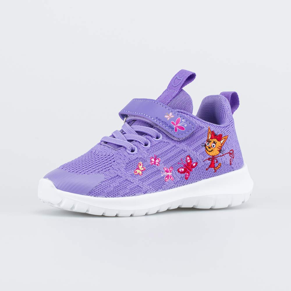 Кроссовки для девочки дошкольного возраста выглядят нарядно за счет принта в виде популярной героини мультфильма Три кота.