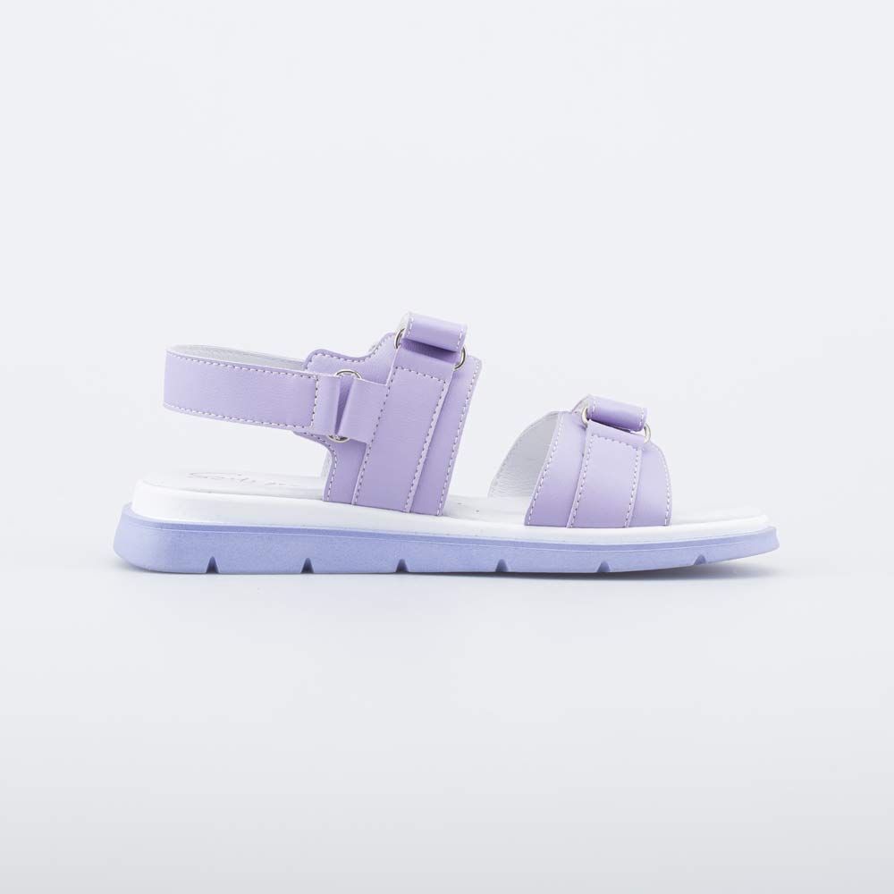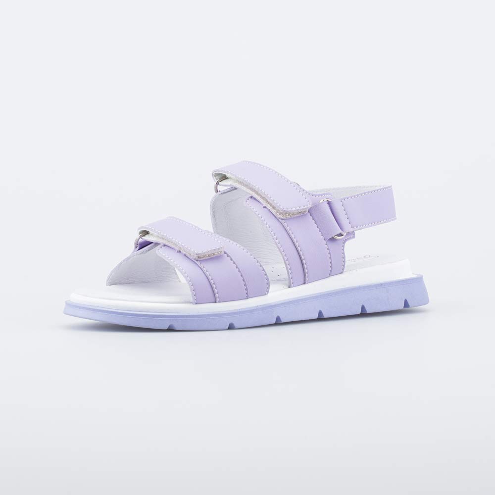 Сандалии выполнены в сиреневом цвете с белым акцентом.