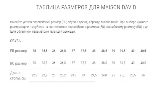 ✅ В закупке указан европейский размер (EU) обуви бренда Tend@nce, M@ison David. При выборе нужного вам размера ориентируйтесь на соответствия европейского размера (EU) русскому размеру (RU) и длине стопы