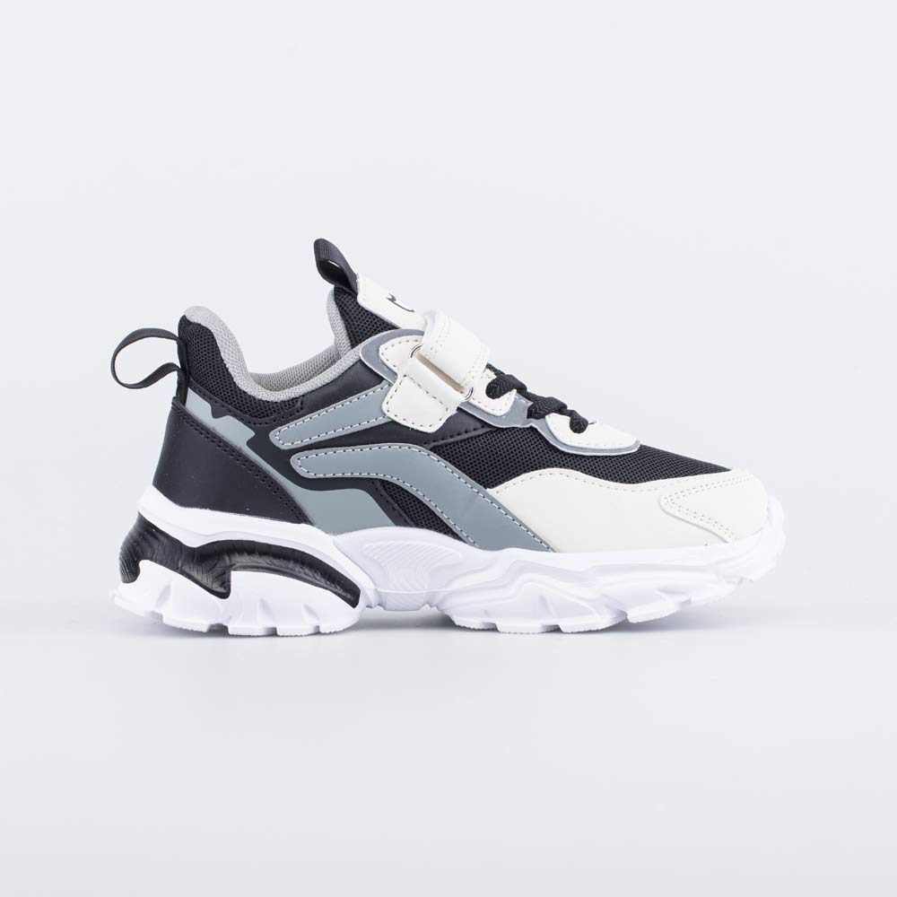 Верх выполнен из комбинации высококачественной искусственной кожи и текстильной сетки, обеспечивающей хорошую воздухопроницаемость модели. Внимание привлекает сочетание трех цветов: белого, черного и серого.