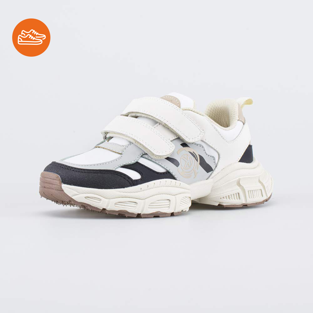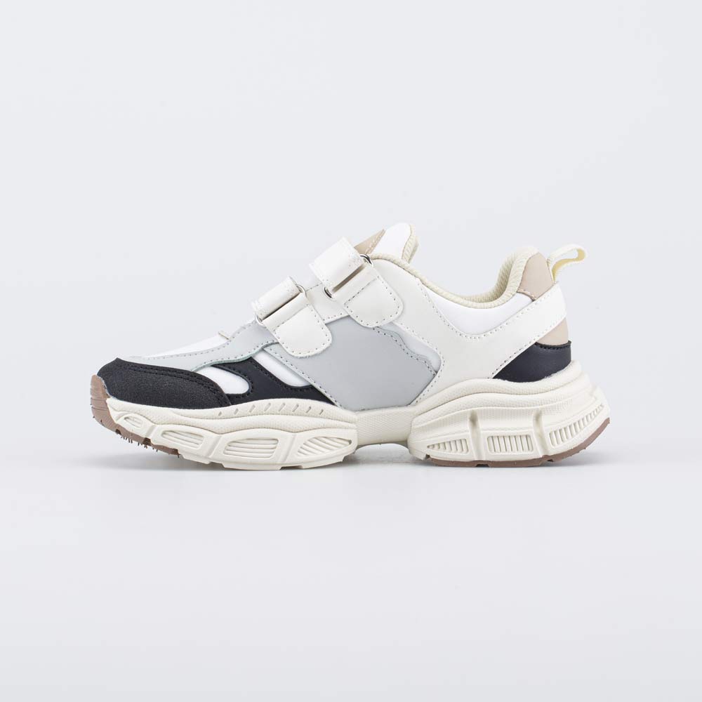 Кроссовки выполнены в трендовом бежевом цвете с контрастными черными акцентами и подходят для мальчика школьного возраста.