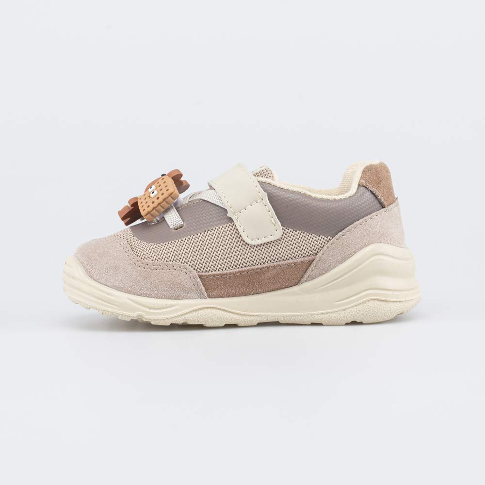 Кроссовки для мальчика выполнены в природных оттенках и украшены съемным декоративным элементом в виде медвежонка.