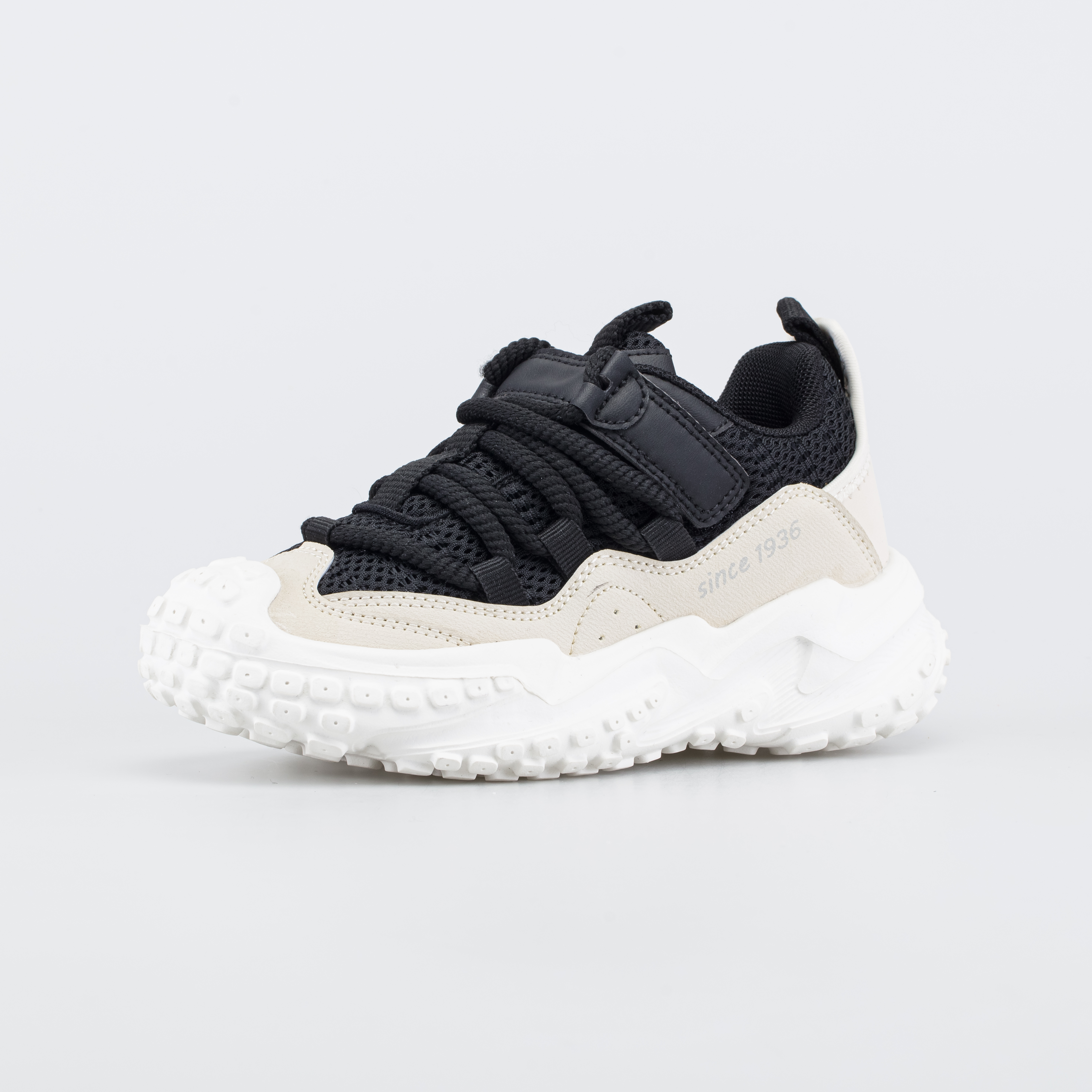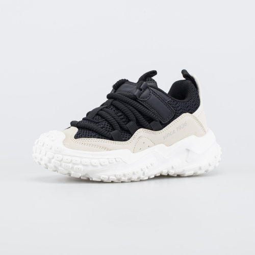 Модные кроссовки для мальчика выполнены в универсальном черном цвете и привлекают внимание массивной фактурной подошвой-байк. Изюминку придает и ненавязчивая надпись с годом основания фабрики «Егорьевск-обувь».