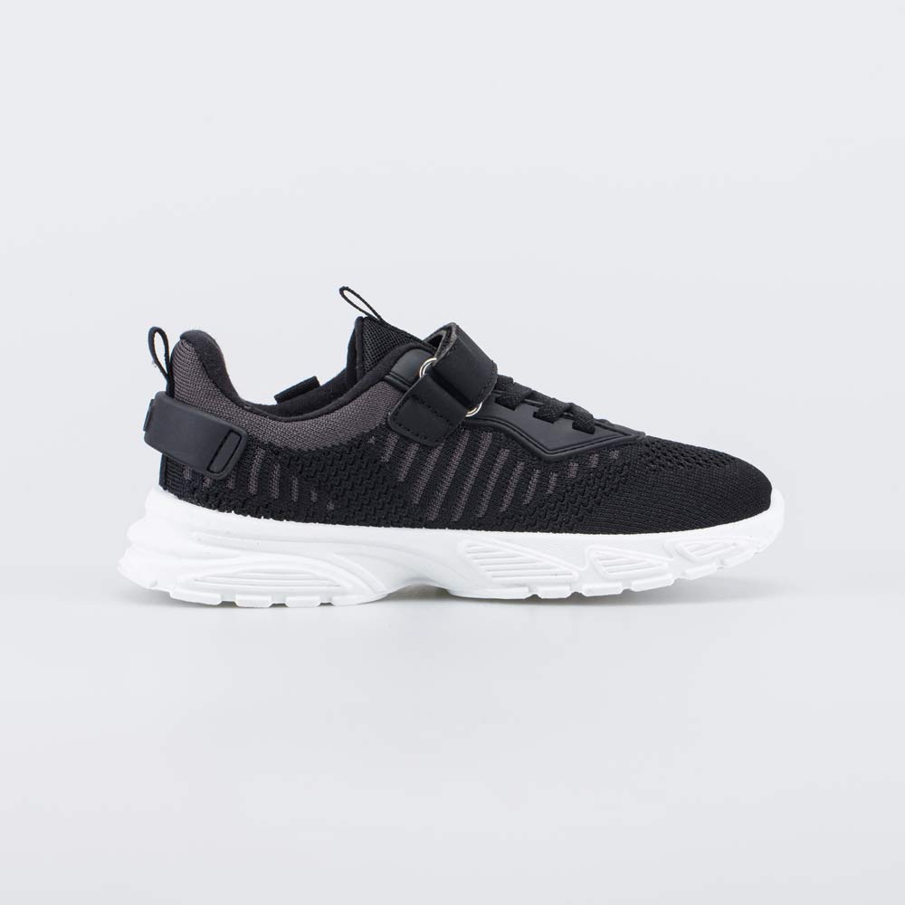 Верх черных кроссовок выполнен из вязаного текстиля, который обеспечивает высокую воздухопроницаемость и сохраняет комфорт внутри подростковой обуви даже при длительной носке.