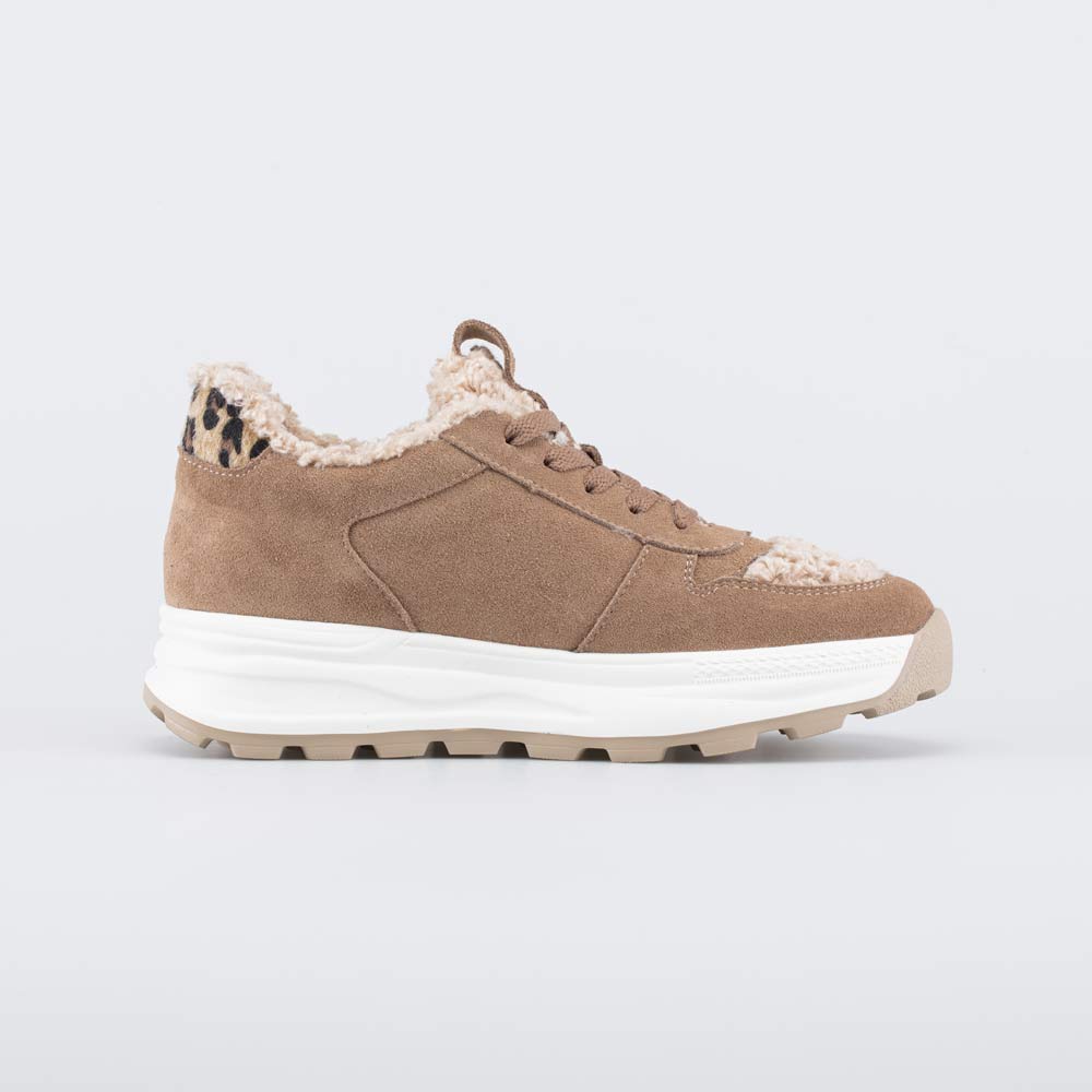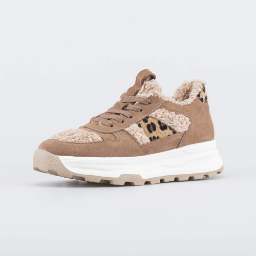 Верх этих зимних кроссовок выполнен из натуральной кожи-велюра, обладающей красивым пишущим эффектом, и дополнен кудрявым мехом барашек.
