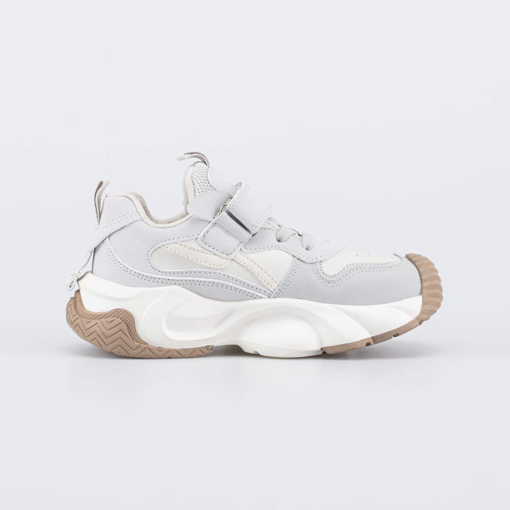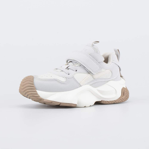 Удобные кроссовки для девочки выполнены в трендовом сером цвете, подчеркнутом модной подошвой с бежевым акцентом.