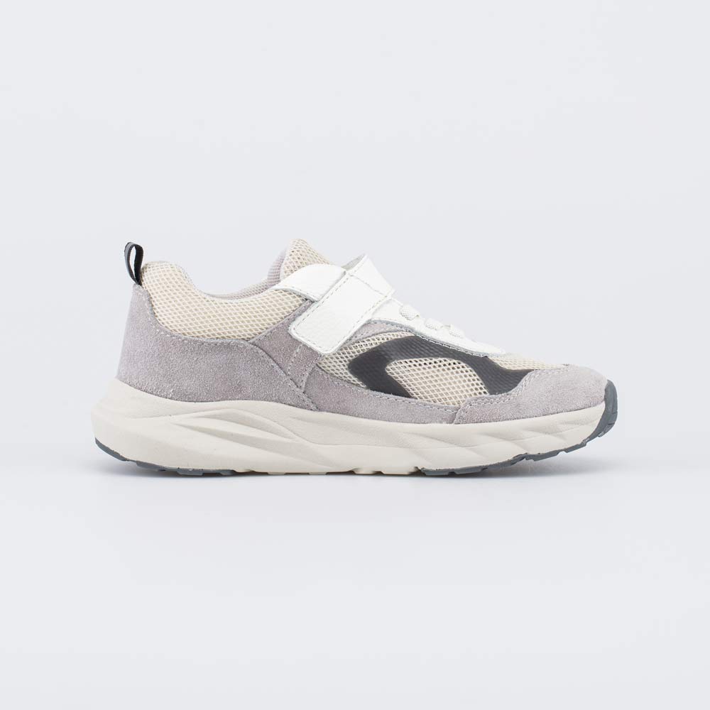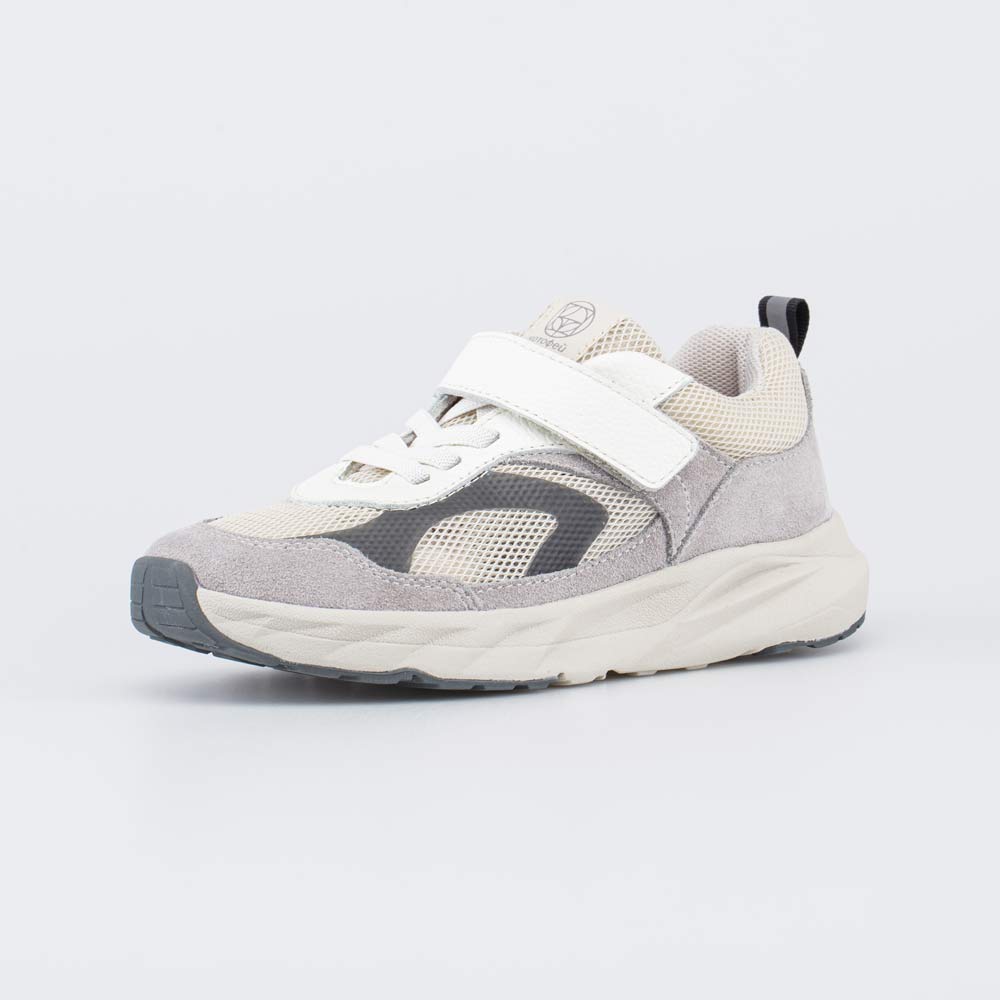 Верх светлых кроссовок изготовлен из комбинации натуральной кожи и текстильной сетки, которая образует сквозные отверстия для высокой воздухопроницаемости подростковой обуви.