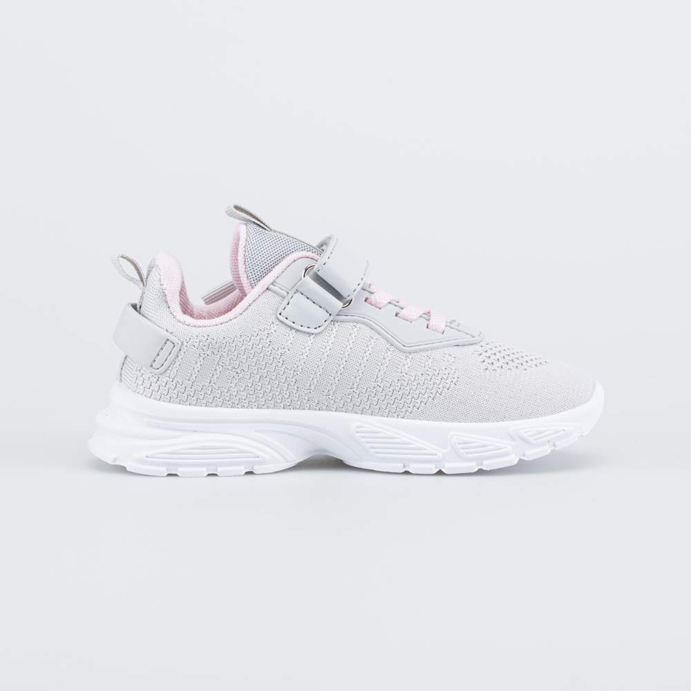 Розово-серые текстильные кроссовки разработаны для девочки дошкольного возраста и отлично подходят для прогулок и игр на свежем воздухе.