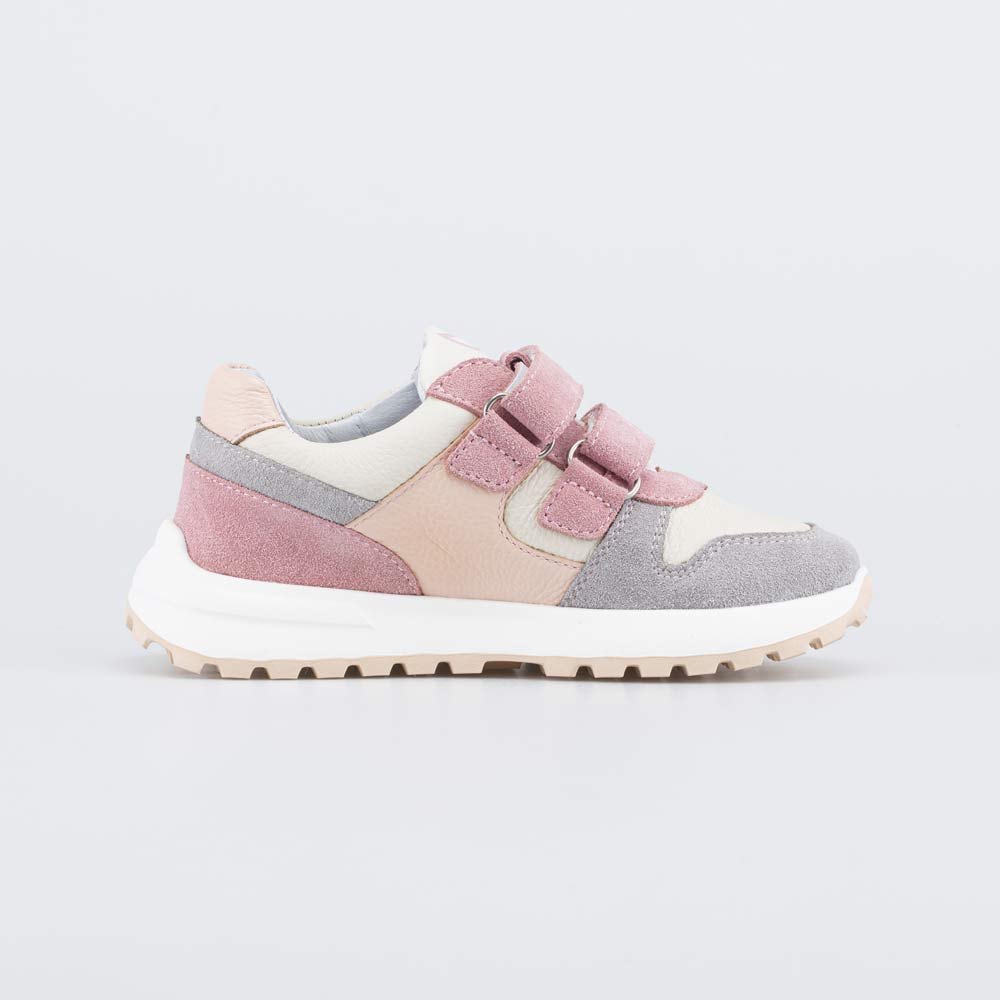 Серо-розовые кроссовки с липучками подходят для девочки школьного возраста.