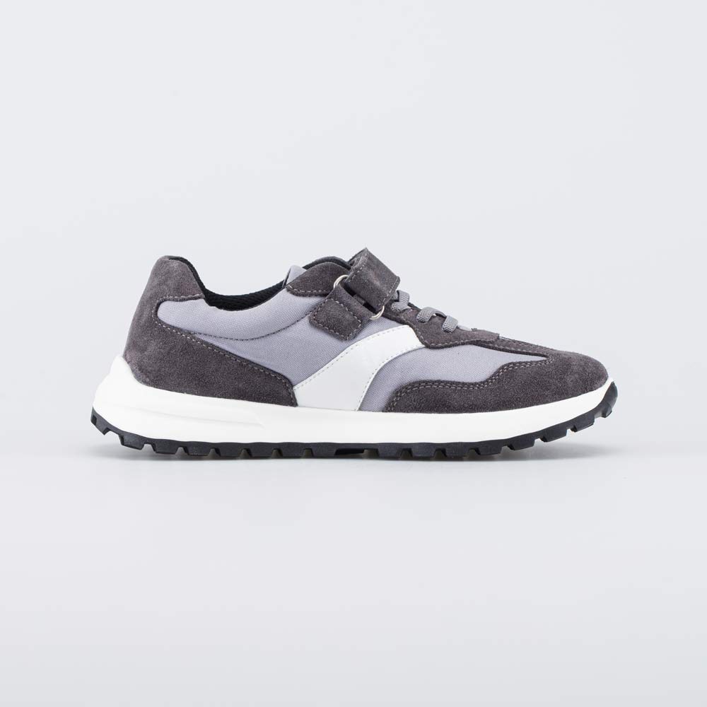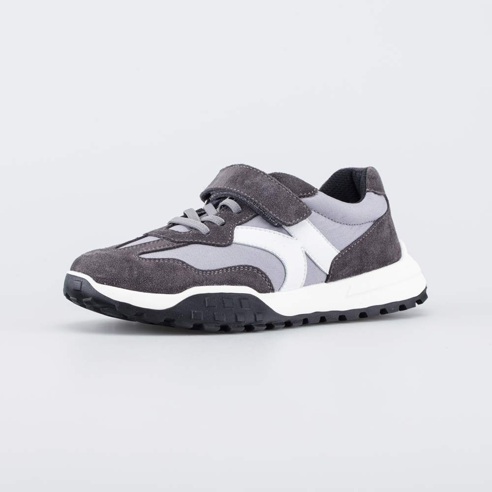 Кожаные кроссовки выполнены в сером цвете и подходят для мальчика школьного возраста.