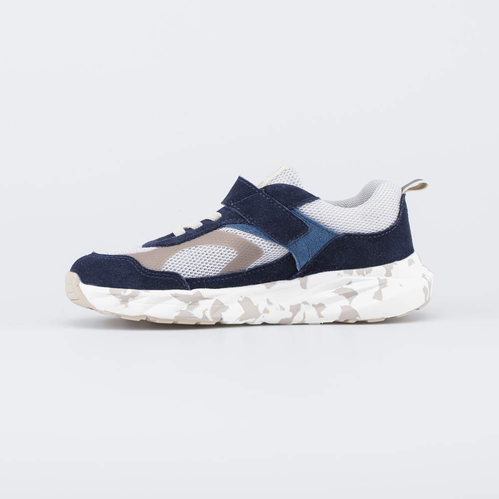 Верх бежево-синих кроссовок изготовлен из комбинации натуральной кожи и текстильной сетки, которая образует сквозные отверстия для высокой воздухопроницаемости подростковой обуви.