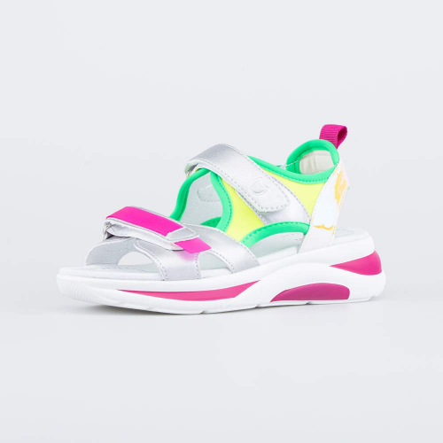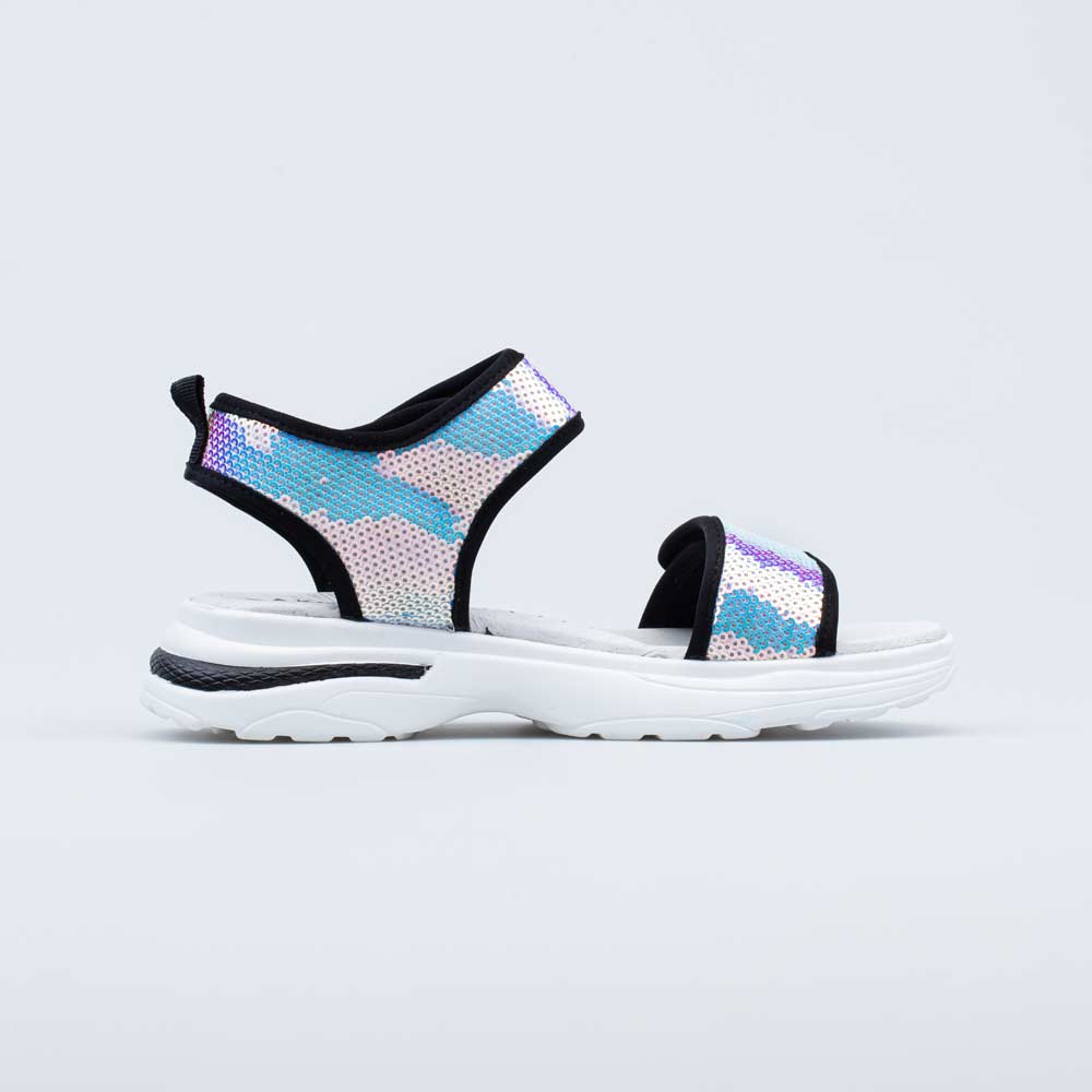 Яркие сандалии имеют верх из высокотехнологичного текстиля, за которым легко ухаживать. Украшены переливающимися пайетками и перламутровыми вставками.
