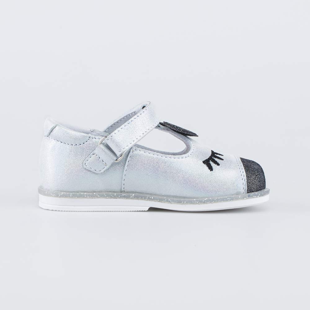 Модель выполнена из материала, покрытого блеском, декорирована принтом в виде милой мордашки и бантом. Подошва наполовину транспарентная - прозрачная и украшена глиттером.