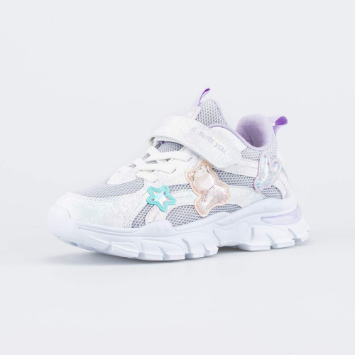 Удобные серебристо-сиреневые кроссовки созданы с учетом особенностей детской стопы и подходят для девочки дошкольного возраста.