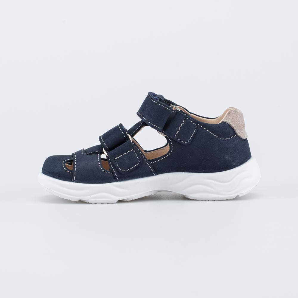 Верх темно-синих сандалий выполнен из гипоаллергенной и дышащей натуральной кожи-нубука. Подкладка и съемная стелька изготовлены из светлой натуральной кожи – не придется переживать, что детская обувь окрасит носочки или колготки.