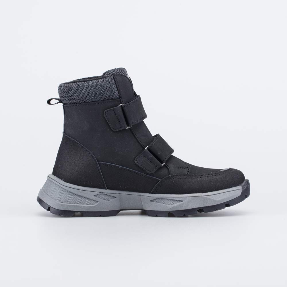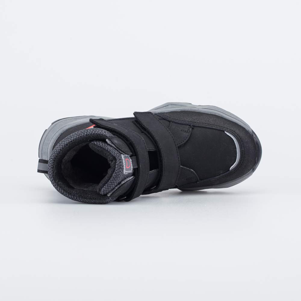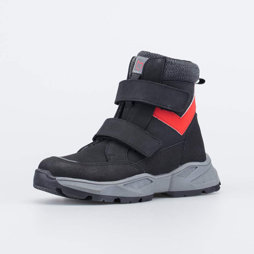 Зимние ботинки черного цвета на меху походят для мальчика-школьника. Верх выполнен из износостойкого и дышащего натурального нубука. Подкладка из шерстяного меха и вкладная войлочная стелька отлично согревают и отводят влагу. Липучки-велькро позволяют быстро обуваться и разуваться. Ботинки по всему периметру защищены кожаной накладкой с полиуретановым покрытием, предохраняющей обувь от реагентов и повреждений. Подошва из ТЭП (термоэластопласта) обеспечивает дополнительную теплоизоляцию и обладает повышенной устойчивостью на зимних дорожках. Ботинки украшены красными вставками. Модель анатомически-правильная: во внутреннем пространстве есть приподнятость пяточной части, которая незаметна внешне, круглый носок не стесняет движений пальцев, в меру жесткий задник фиксирует пятку, а войлочная стелька приформовывается к стопе, принимая индивидуальную форму. Все это положительно влияет на развитие опорно-двигательного аппарата.