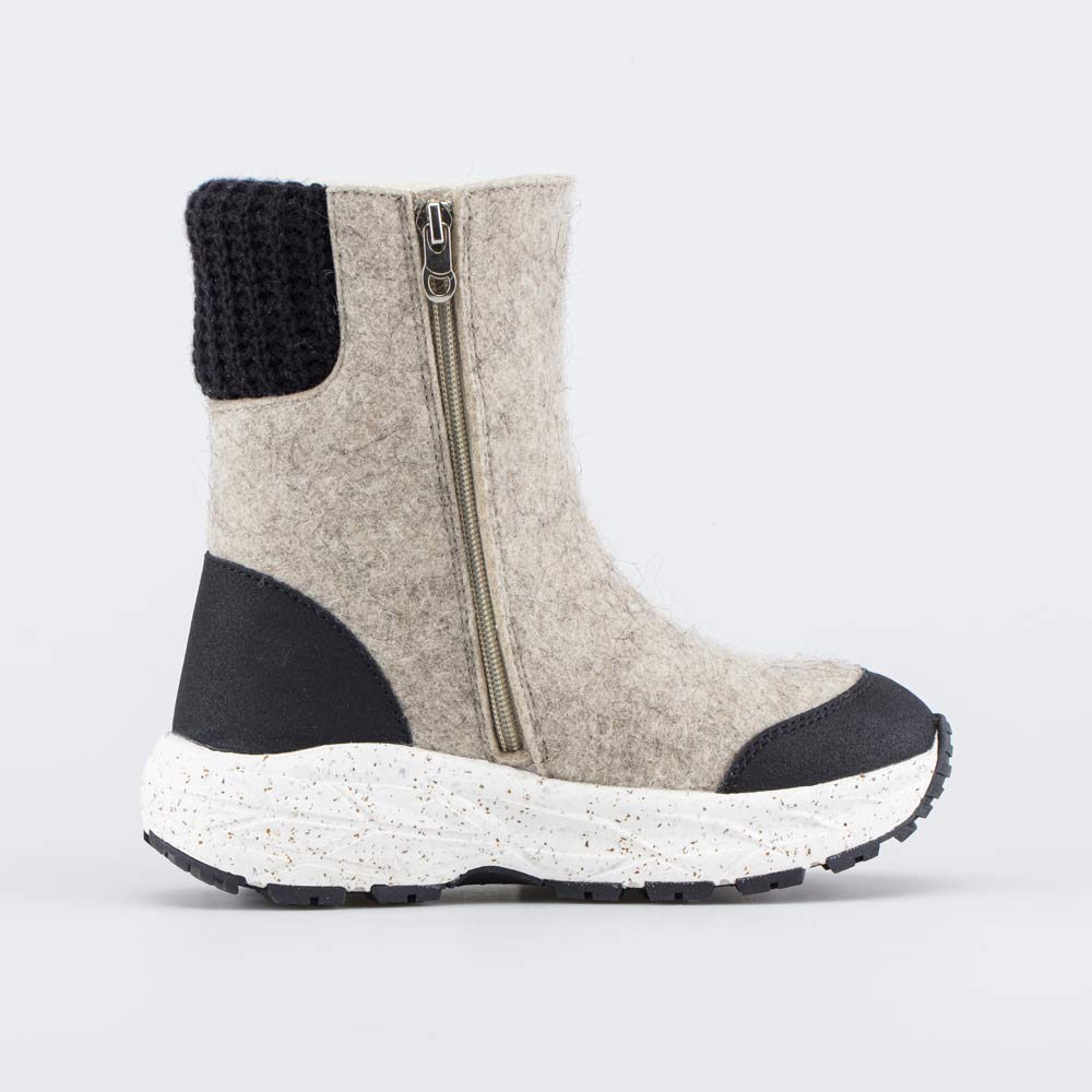 Бежевые валенки на подошве модной кроссовочной формы выглядят современно и подходят как для мальчика, так и для девочки. Дополнительную изюминку придает вязаный манжет.