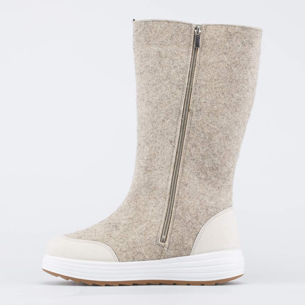 Верх выполнен из натурального войлока (100% овечья шерсть). Войлок плотный, с водоотталкивающими свойствами, дышит и создаёт приятный микроклимат вокруг стопы на улице и в помещении. Носок и пятка защищены от реагентов кожаными накладками с ПУ-покрытием.