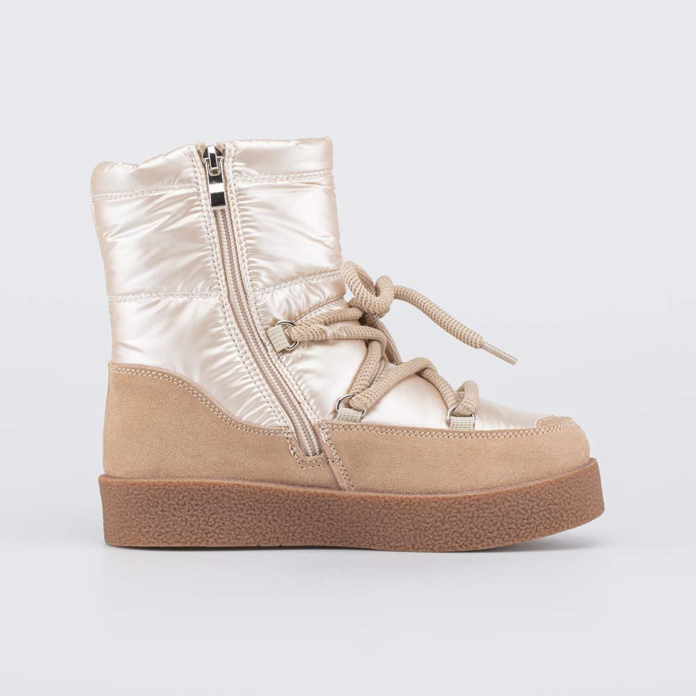 Зимние сапожки имеют верх из непродуваемого и водоотталкивающего текстиля. По всему периметру вдоль подошвы он защищен от грязи и реагентов накладкой из натуральной кожи-велюра.