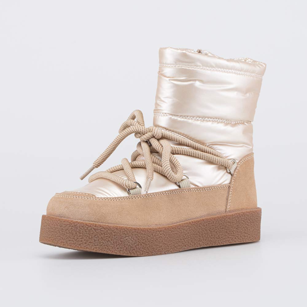 Зимние сапожки имеют верх из непродуваемого и водоотталкивающего текстиля. По всему периметру вдоль подошвы он защищен от грязи и реагентов накладкой из натуральной кожи-велюра.