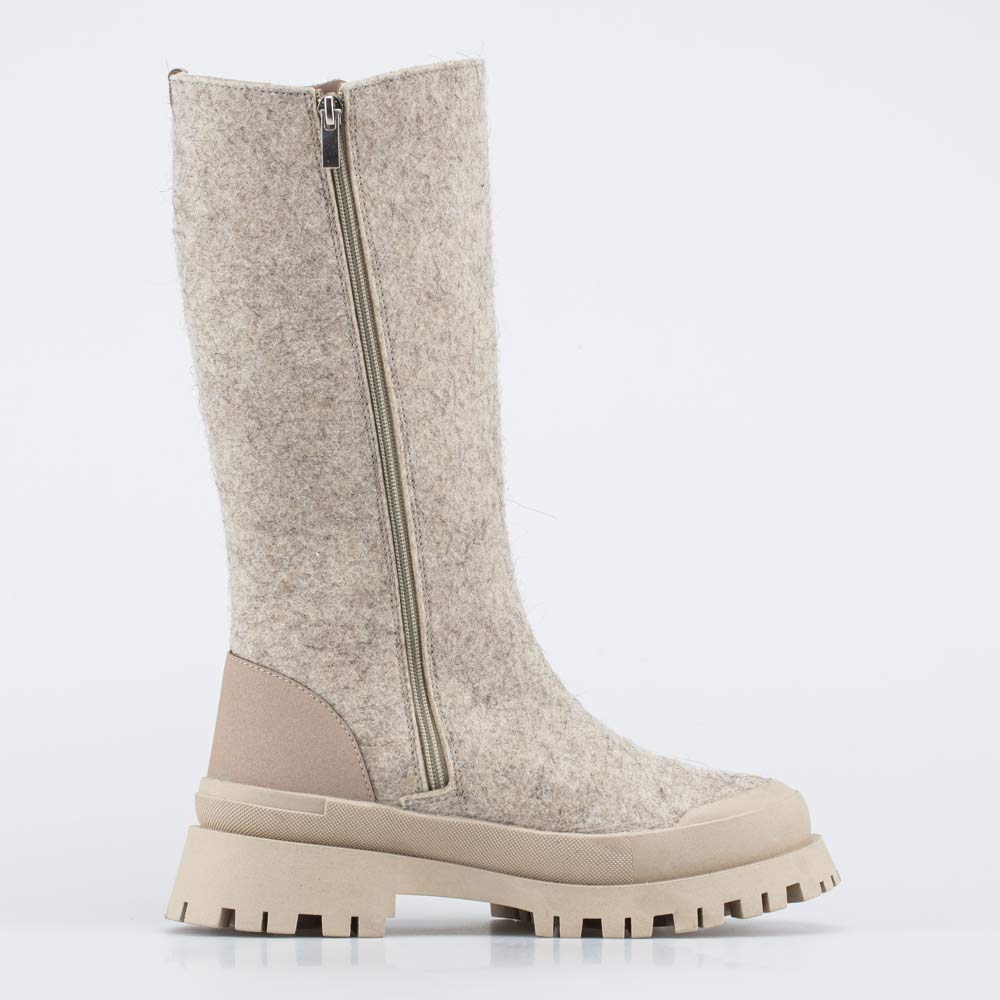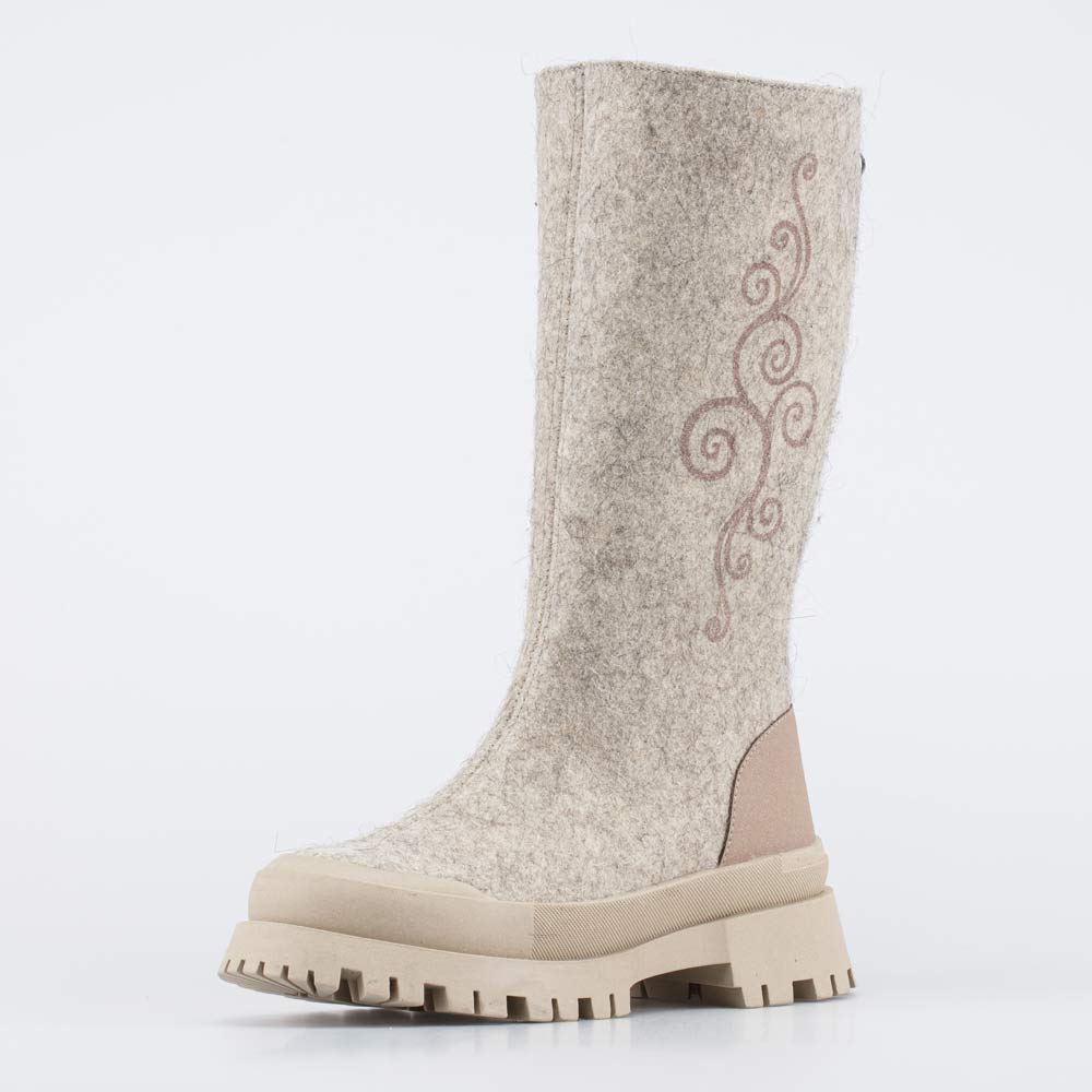 Подошва из ТЭП (термоэластопласта) с высоким протектором обладает повышенной устойчивостью на зимних дорожках. По всему периметру образует глубокий наплыв на войлок, предохраняя его от влаги и реагентов. Пяточная часть дополнительно защищена кожаной накладкой.