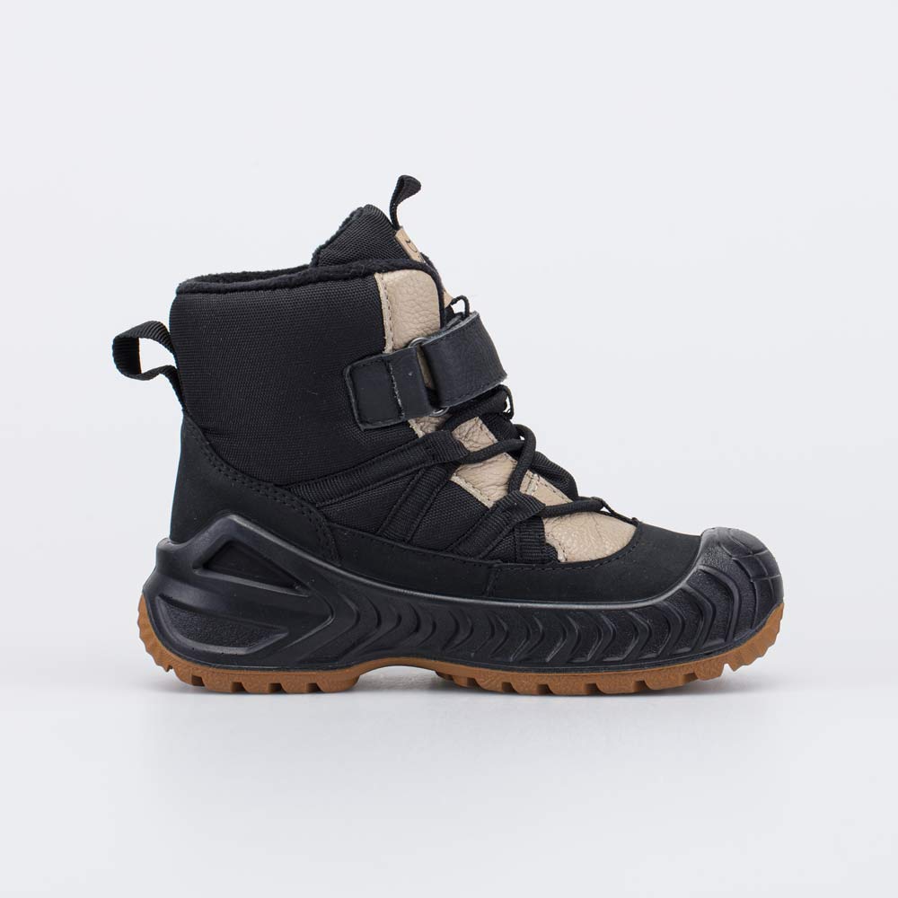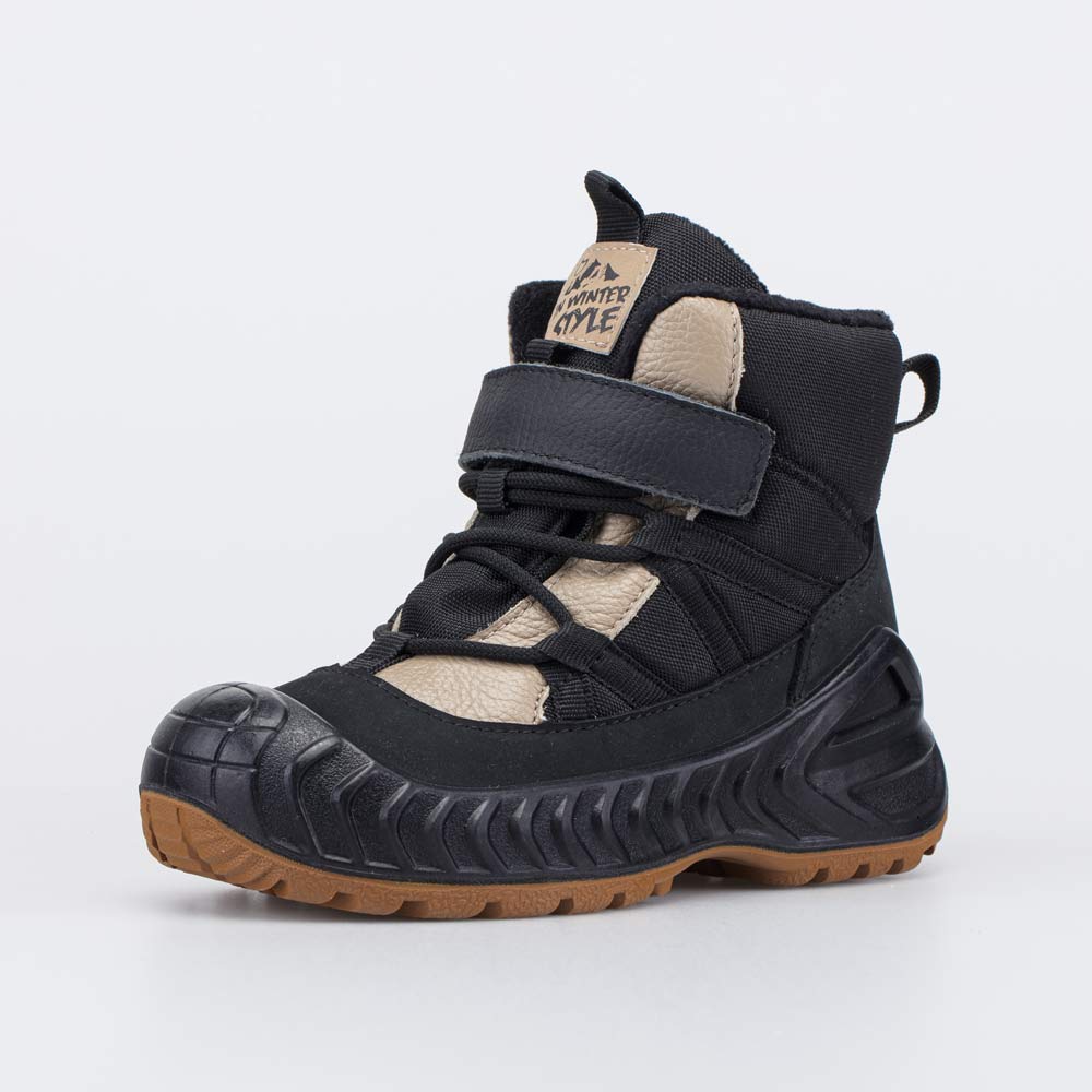 Верх этих детских ботинок изготовлен из ветронепродуваемого текстиля. До 1/3 высоты модель защищена от реагентов натуральной кожей с ПУ-покрытием.