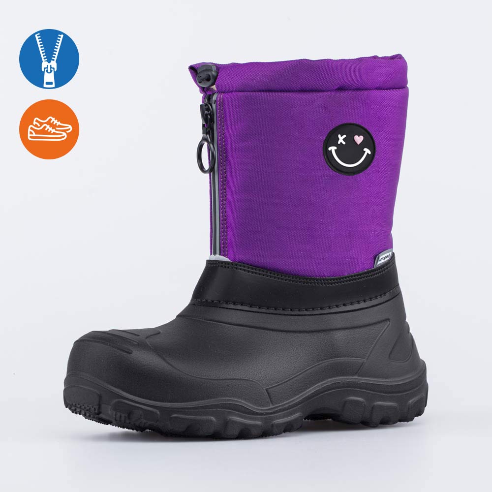 Материал верха – легкий в уходе текстиль на основе нейлона, который защищает от ветра, грязи и брызг. Детская обувь оснащена светоотражающими элементами и украшена позитивной нашивкой.