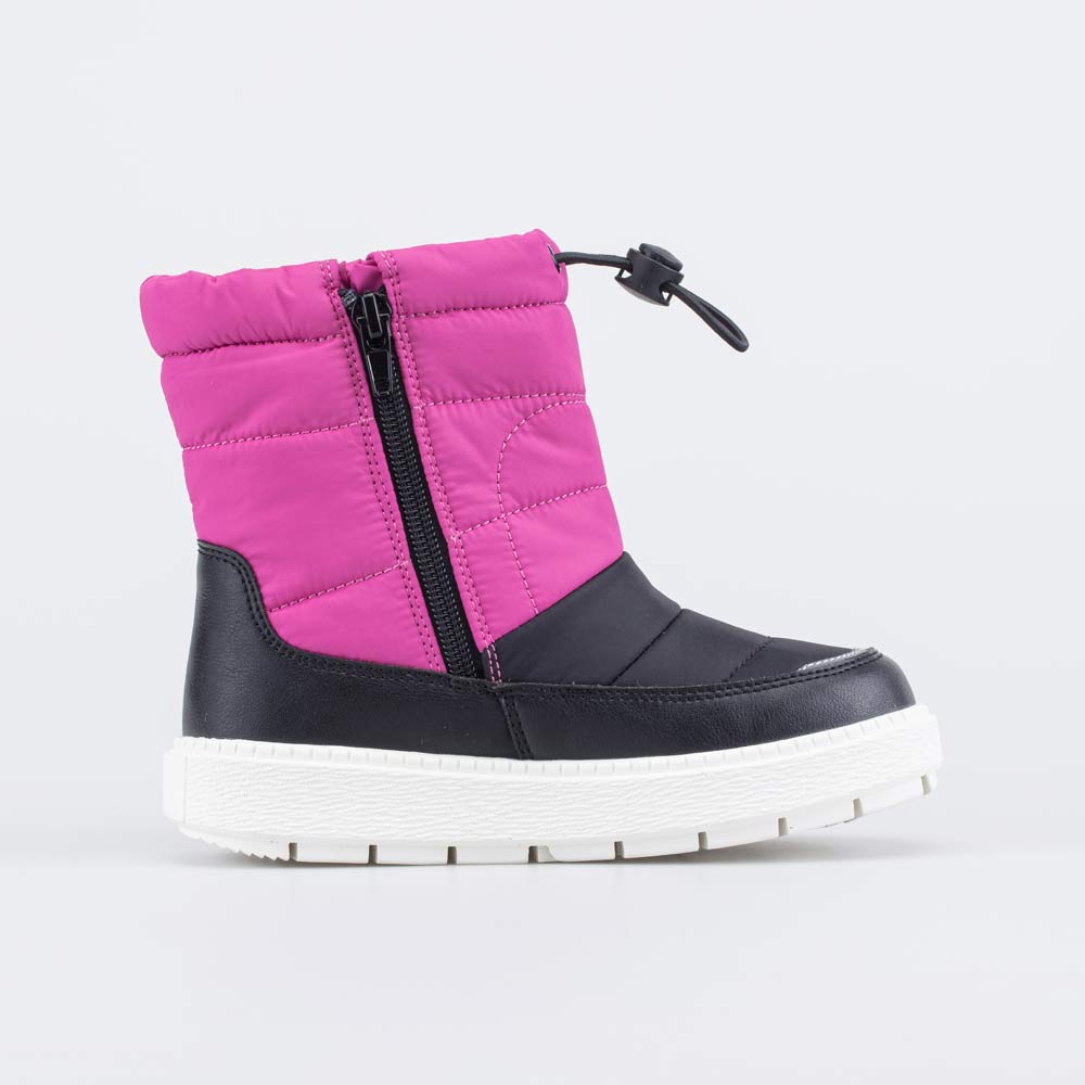 Зимние сапожки-дутики для девочки выполнены в сочетании фуксии и черного.