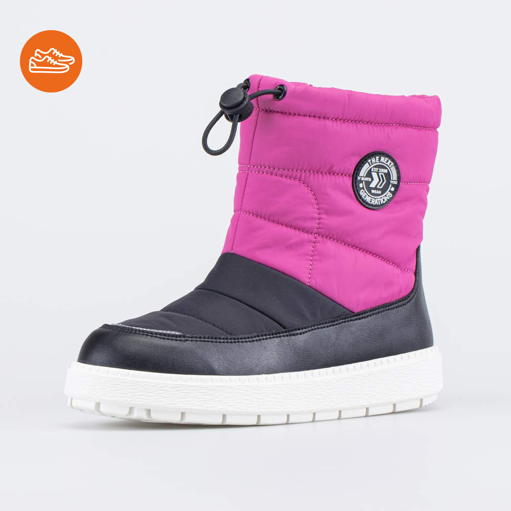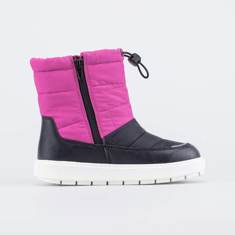Зимние сапожки-дутики для девочки выполнены в сочетании фуксии и черного.