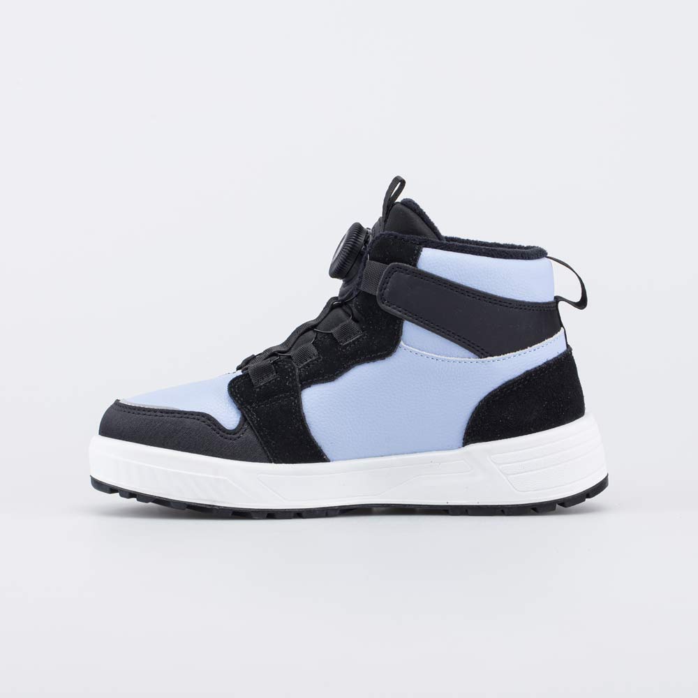 Верх изготовлен из натуральной кожи в сочетании черного и голубого. Носочная и пяточная части защищены дополнительной кожаной накладкой с полиуретановым покрытием.