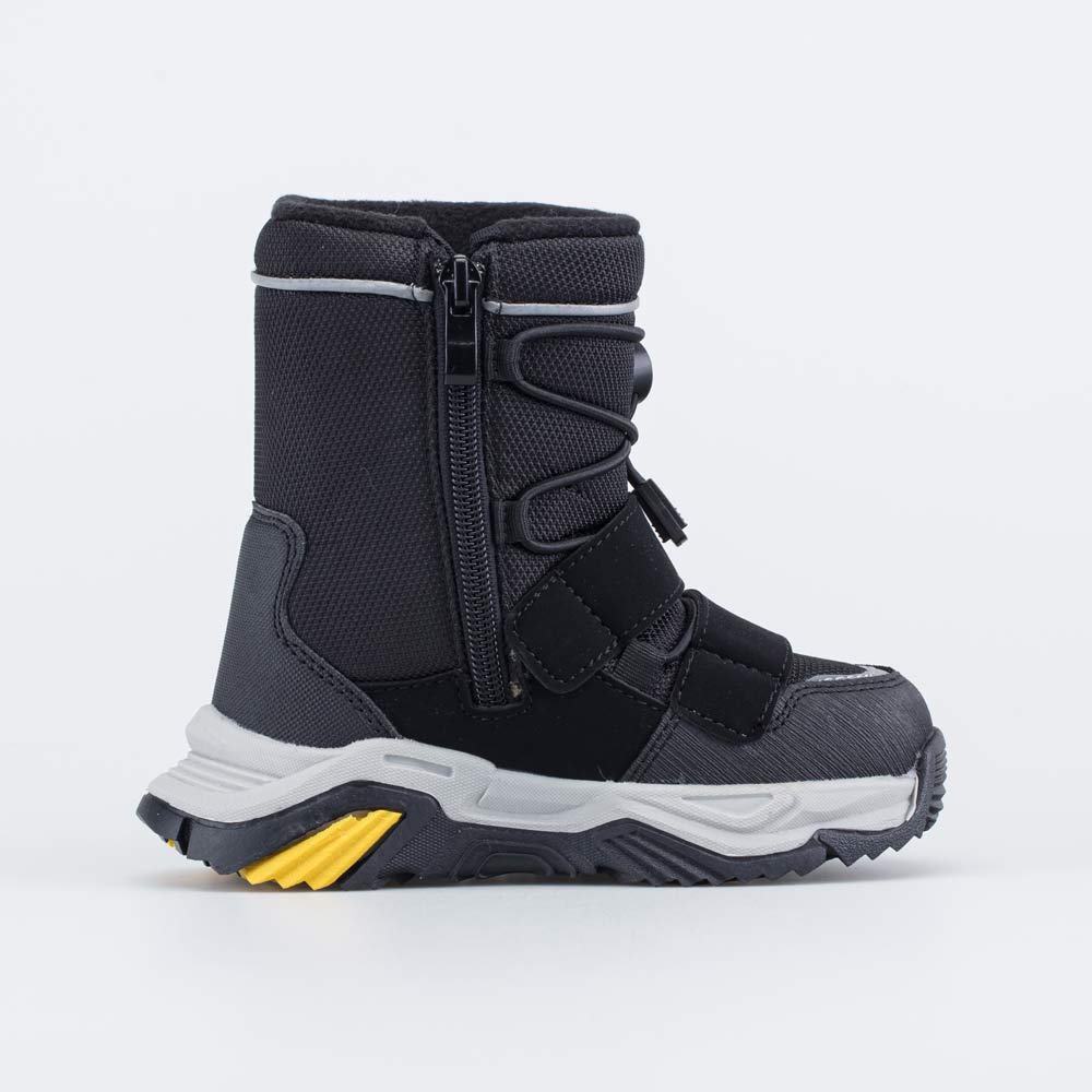 Зимние сапожки-дутики для мальчика выполнены в черном цвете и декорированы яркими желтыми вставками.