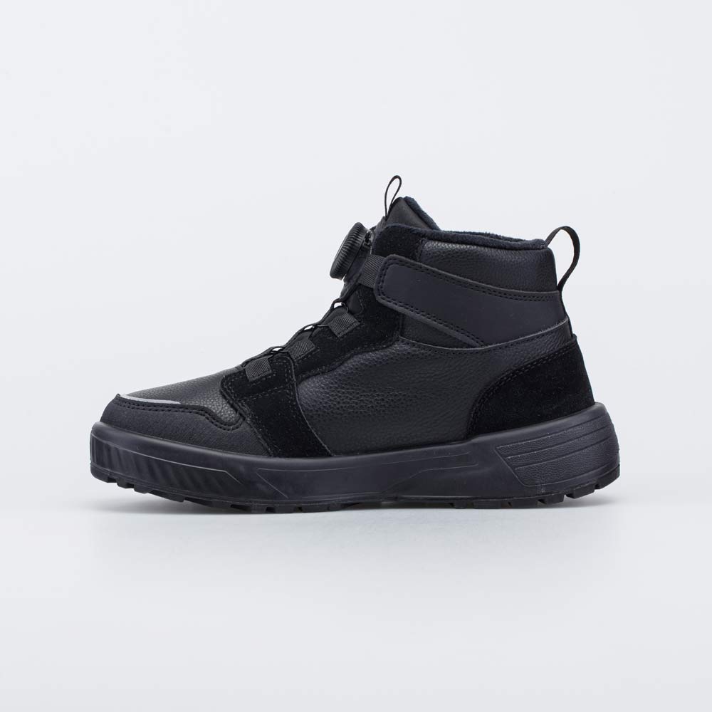 Детские зимние ботинки, декорированные объемной пластизольной нашивкой в урбанистическом стиле, походят для мальчика.