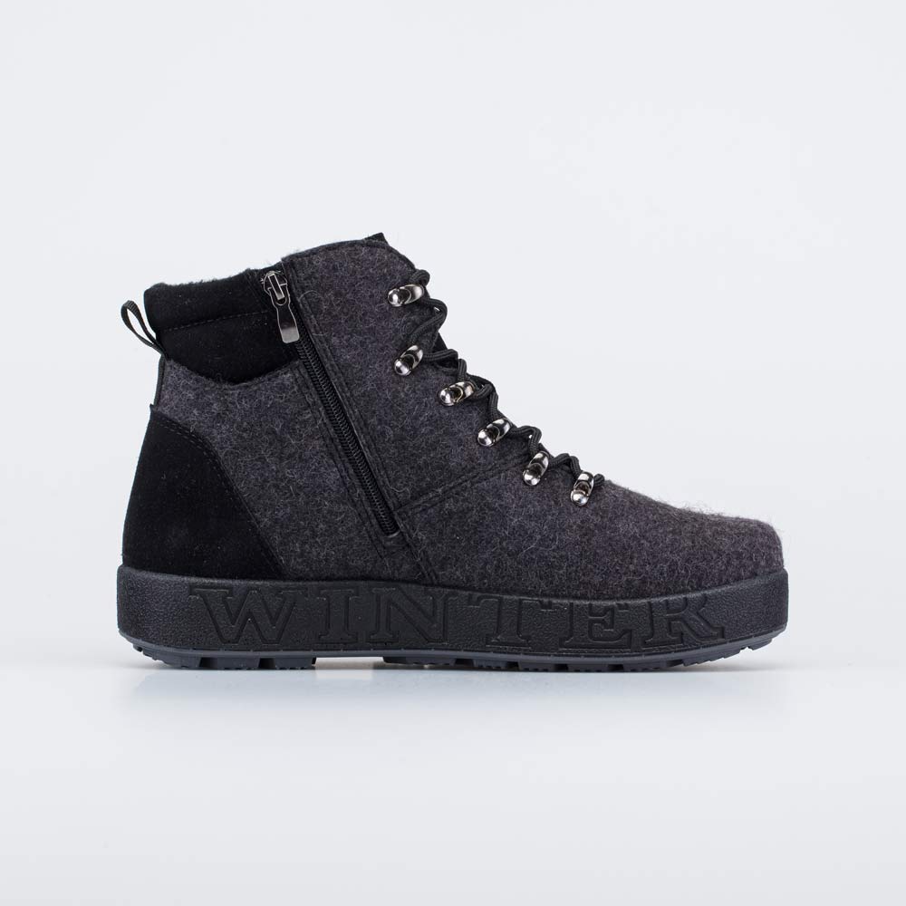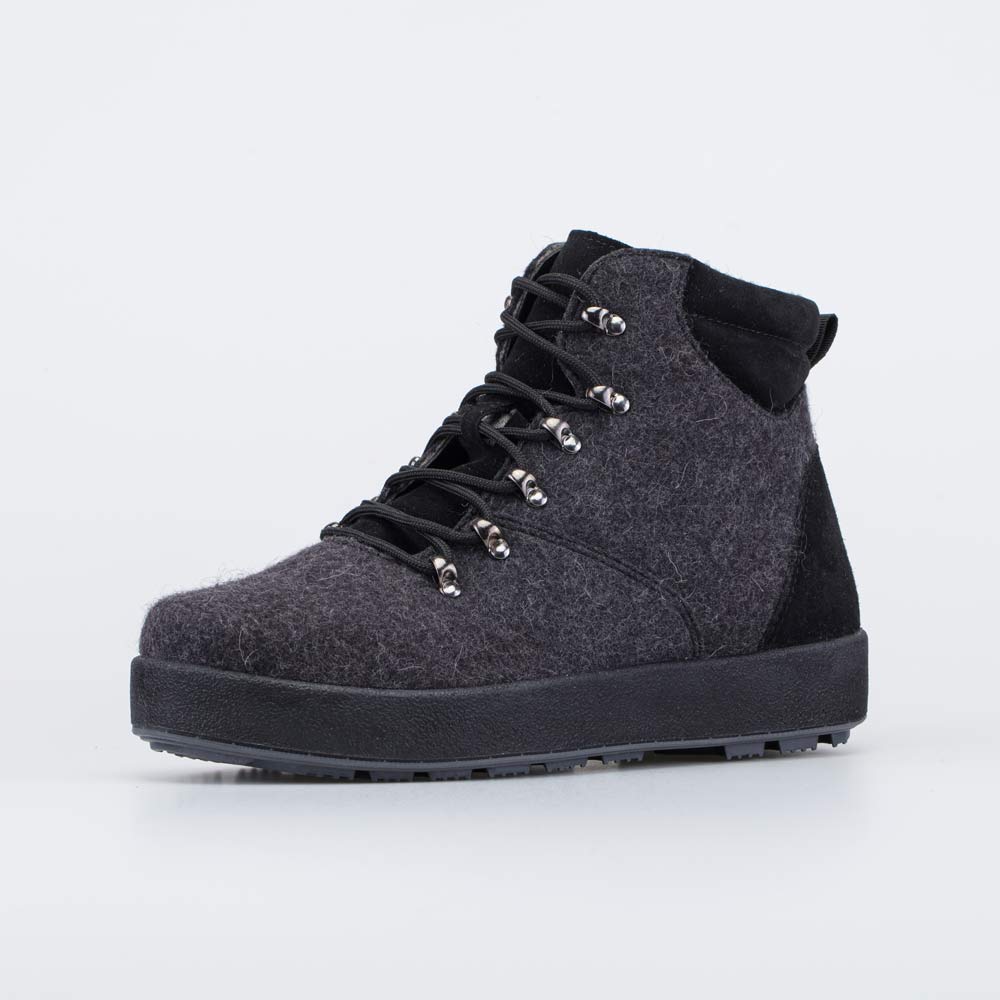 Шнурки подчеркивают концепцию ботинок из войлока, а застежка-молния дает возможность быстро обуваться и разуваться.