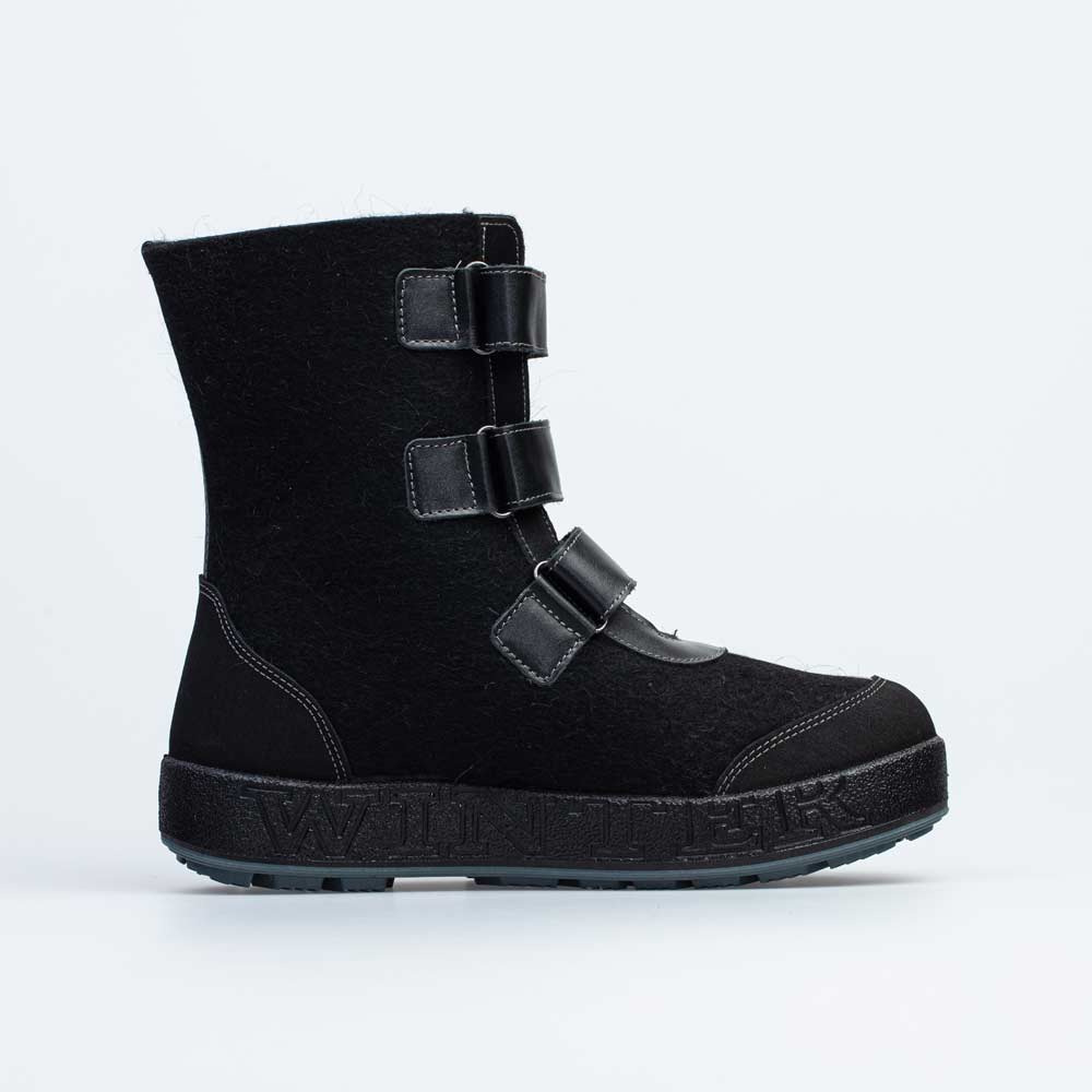 Верх этих черных валенок изготовлен из плотного и дышащего натурального войлока. Носочная и пяточная части защищены от влаги и реагентов кожаными накладками с ПУ-покрытием.