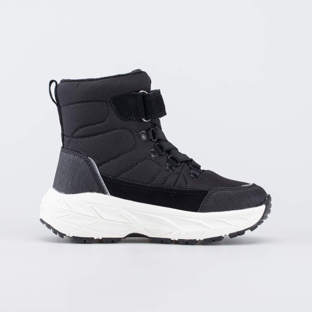 Высокие ботинки-дутики для мальчика выполнены в черном цвете, который эффектно подчеркнут контрастом белой подошвы.