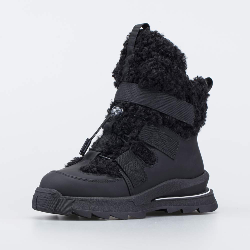 Черные зимние сапожки-дутики украшены мягким и кудрявым искусственным мехом.