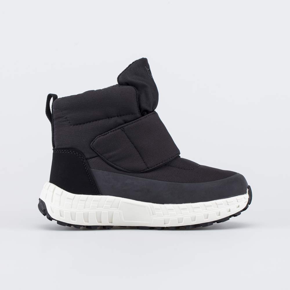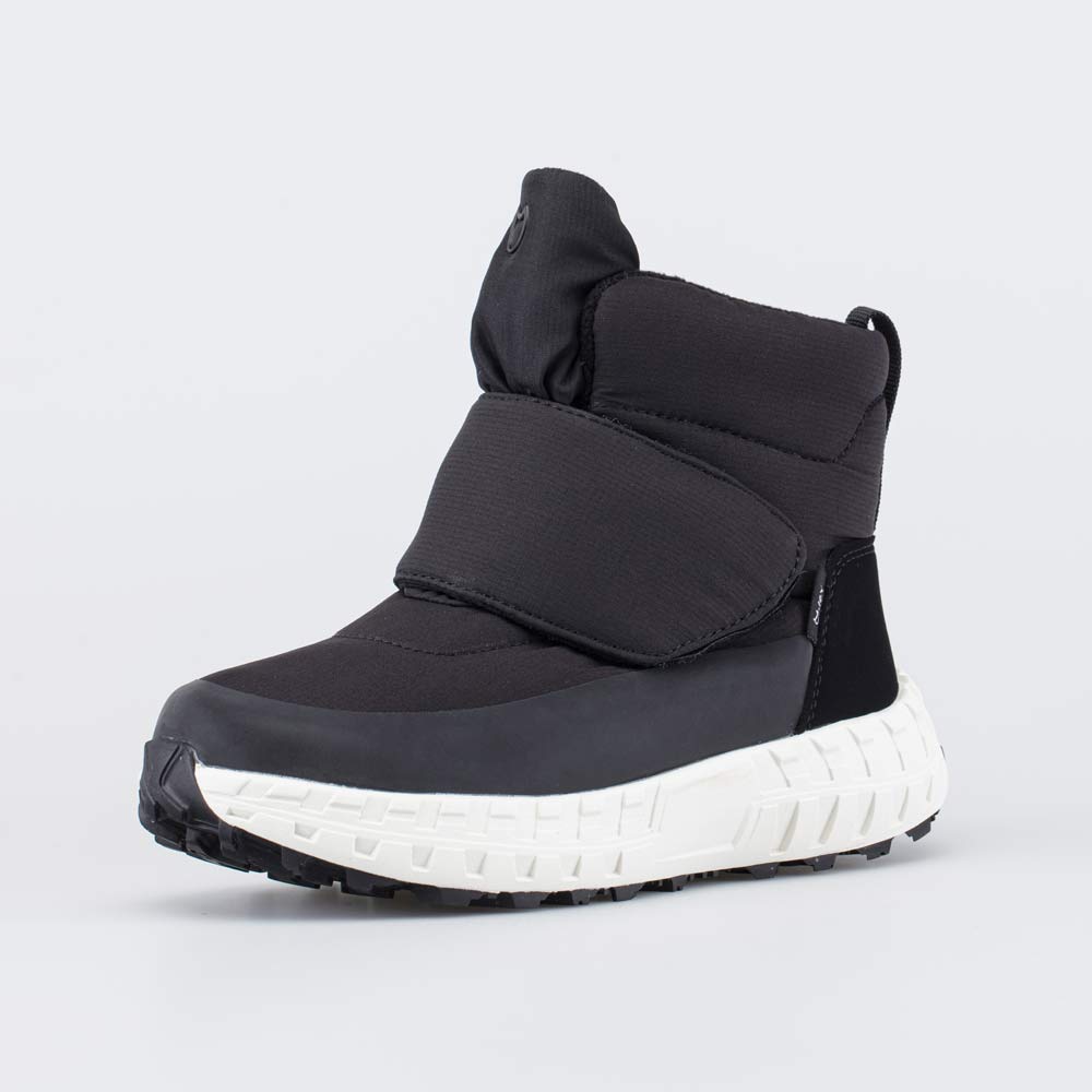 Верх этих черных сапожек изготовлен из легкого в уходе и ветронепродуваемого текстиля. Язычок прошит до верха, что препятствует попаданию снега внутрь. Вдоль подошвы модель усилена накладкой из искусственной кожи.