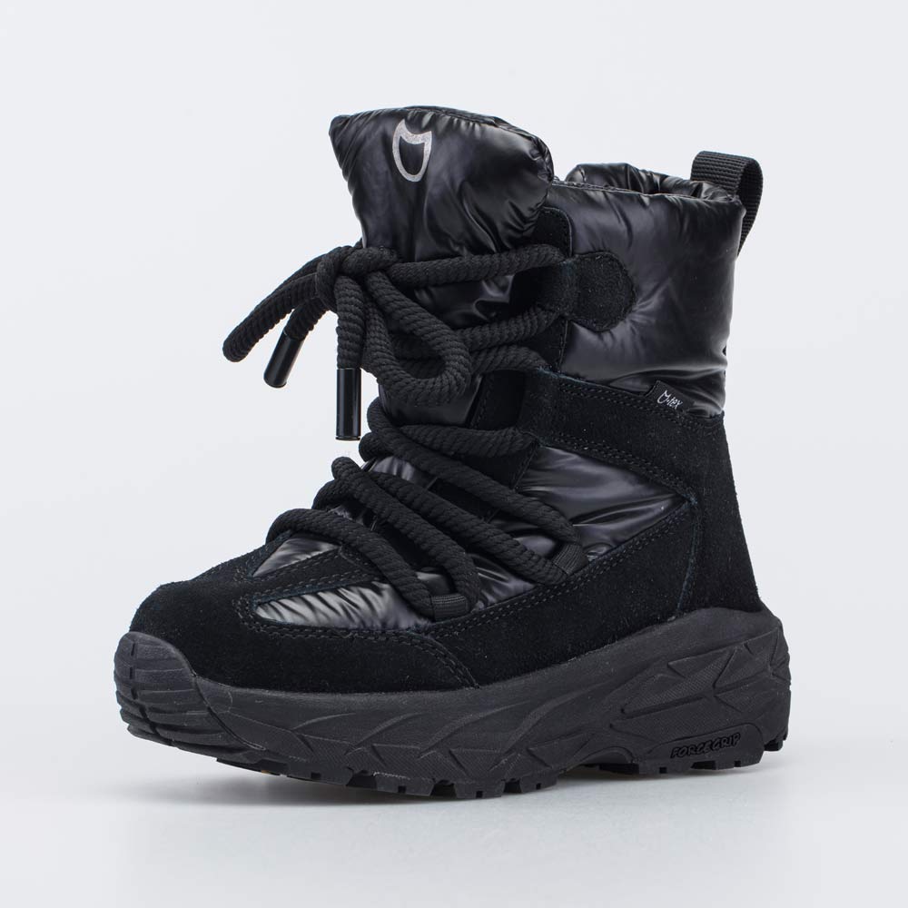 Зимние мембранные сапожки-дутики, декорированные массивной фронтальной шнуровкой, обеспечивают максимальный комфорт во время активного движения.