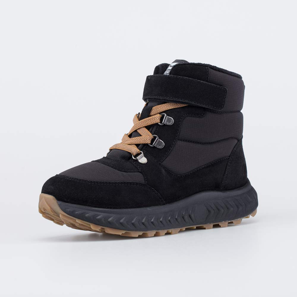 Зимние ботинки на липучках дополнены шнурками, которые не придется каждый раз завязывать.