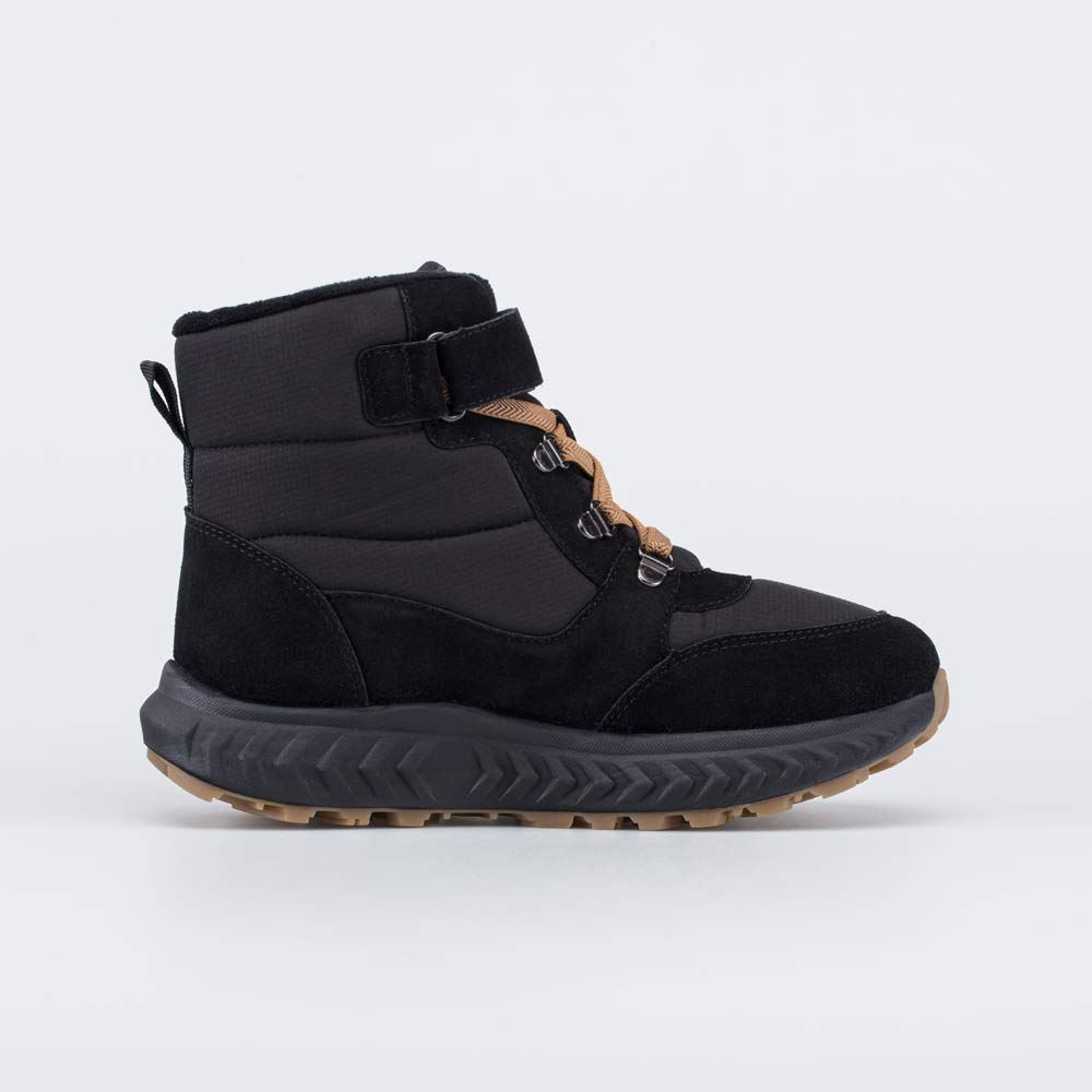 Эти черные ботинки имеют верх из легкого в уходе текстиля и натуральной кожи-велюра.