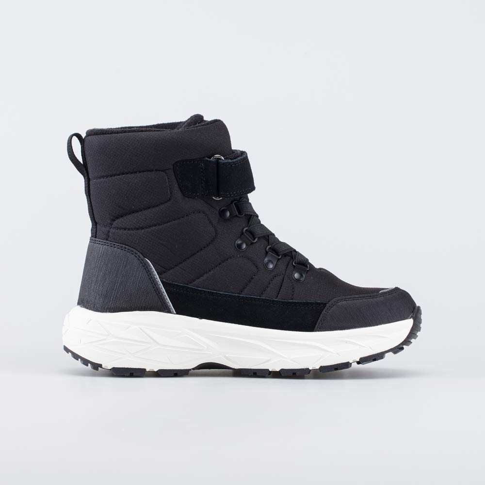 Высокие ботинки-дутики для мальчика выполнены в черном цвете, который эффектно подчеркнут контрастом белой подошвы.
