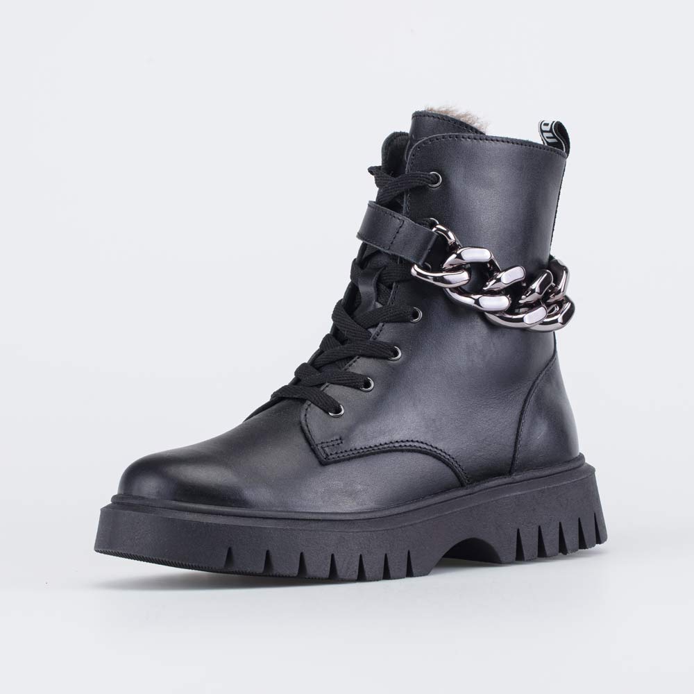Высокие зимние ботинки для девочки, декорированные массивной цепочкой, походят для девочки подросткового возраста. Лаконичный дизайн позволяет сочетать их с разными образами.