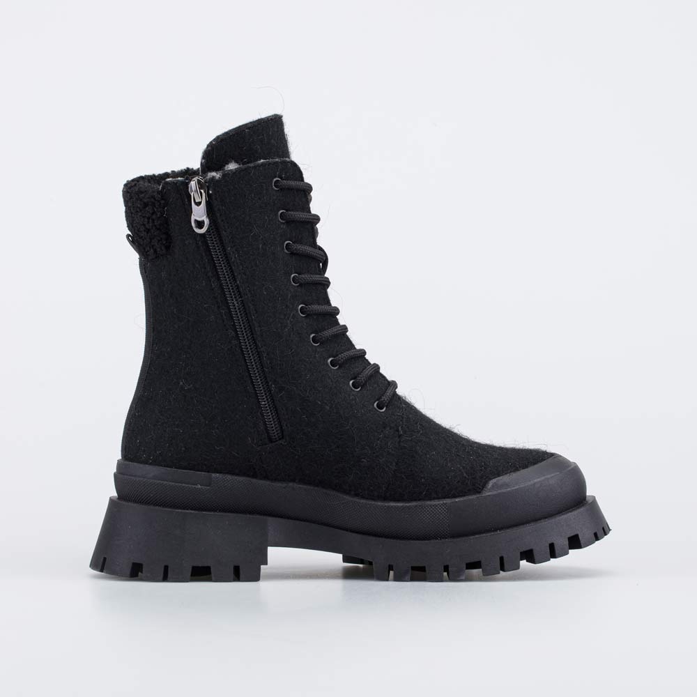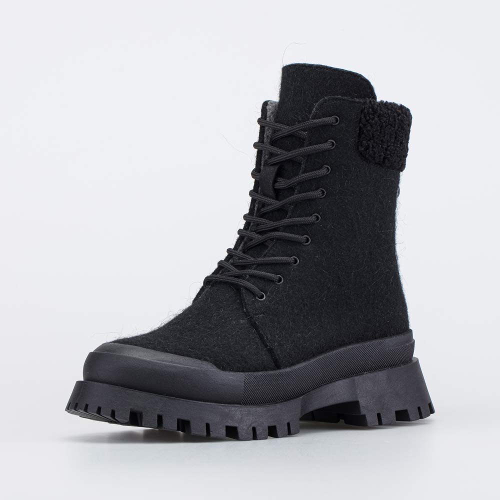 Женские войлочные ботинки сочетают в себе комфорт натуральных материалов и современный стиль. Изюминкой модели становится тракторная подошва и манжет, выполненный в тренде мех под барашка.