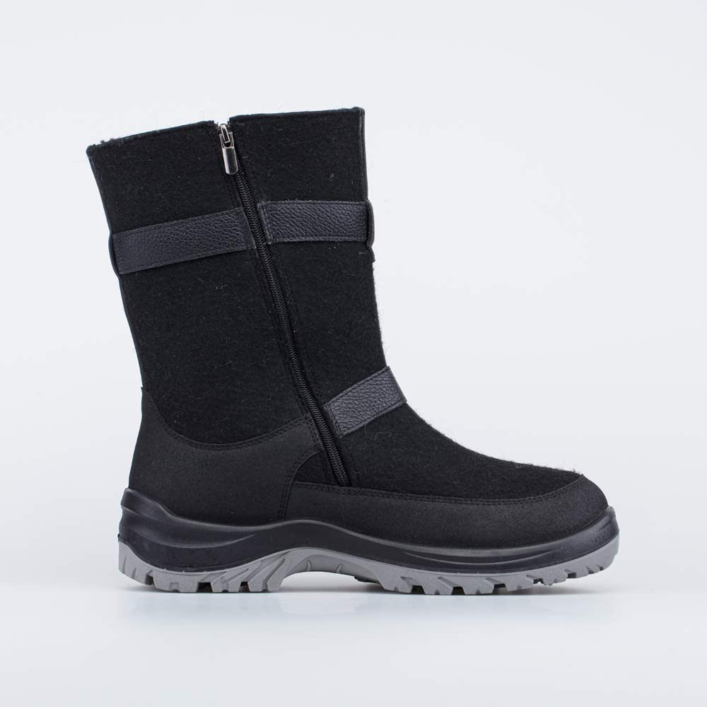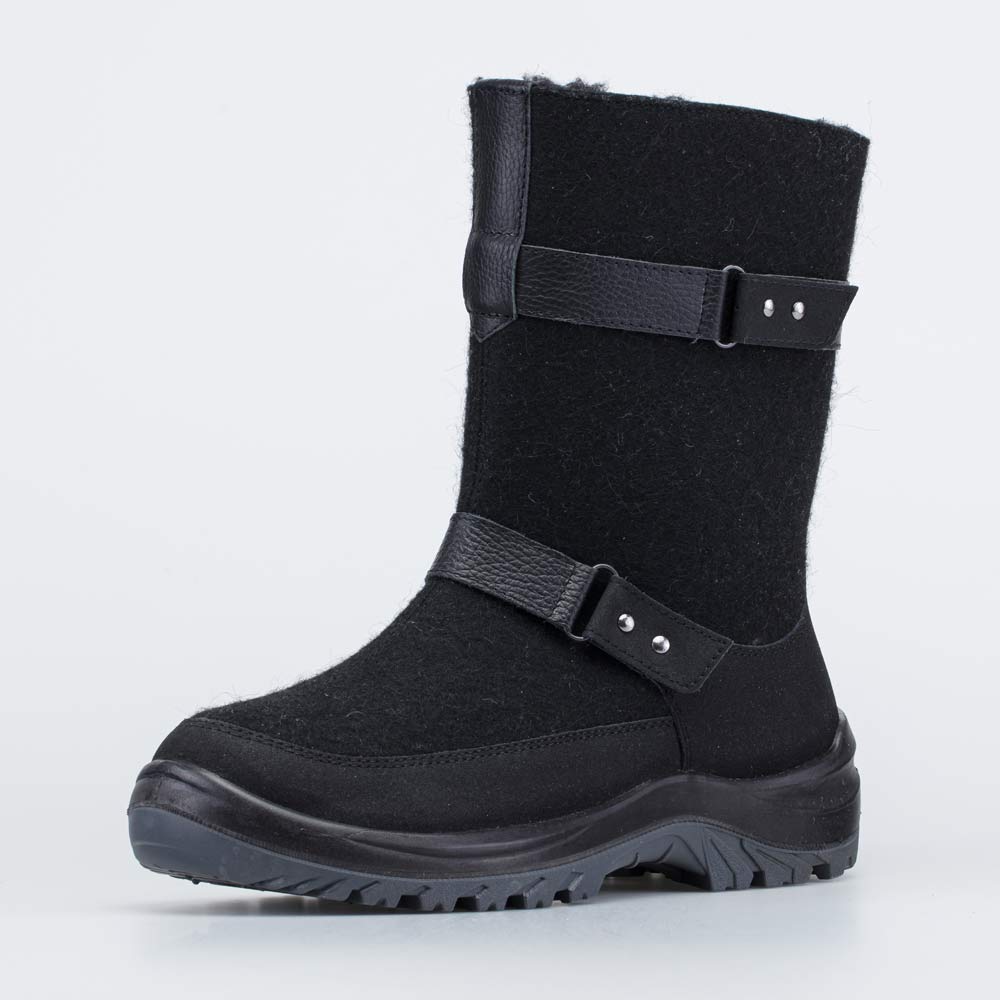 Черные валенки с меховой подкладкой рассчитаны на сильные морозы и подходят для носки, как за городом, так и в городских условиях – от влаги и реагентов их надежно защищают кожаные накладки с ПУ-покрытием, которые имеются по всему периметру вдоль подошвы.