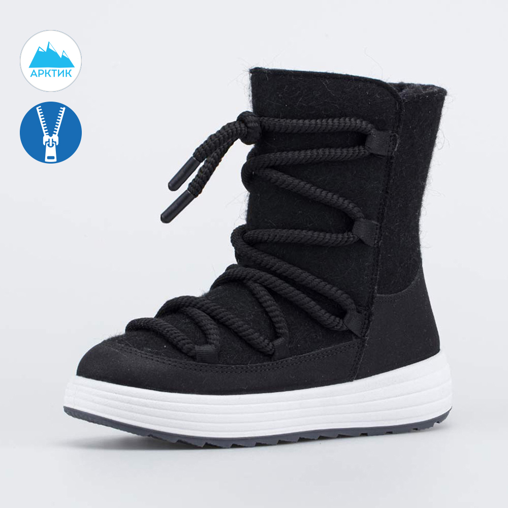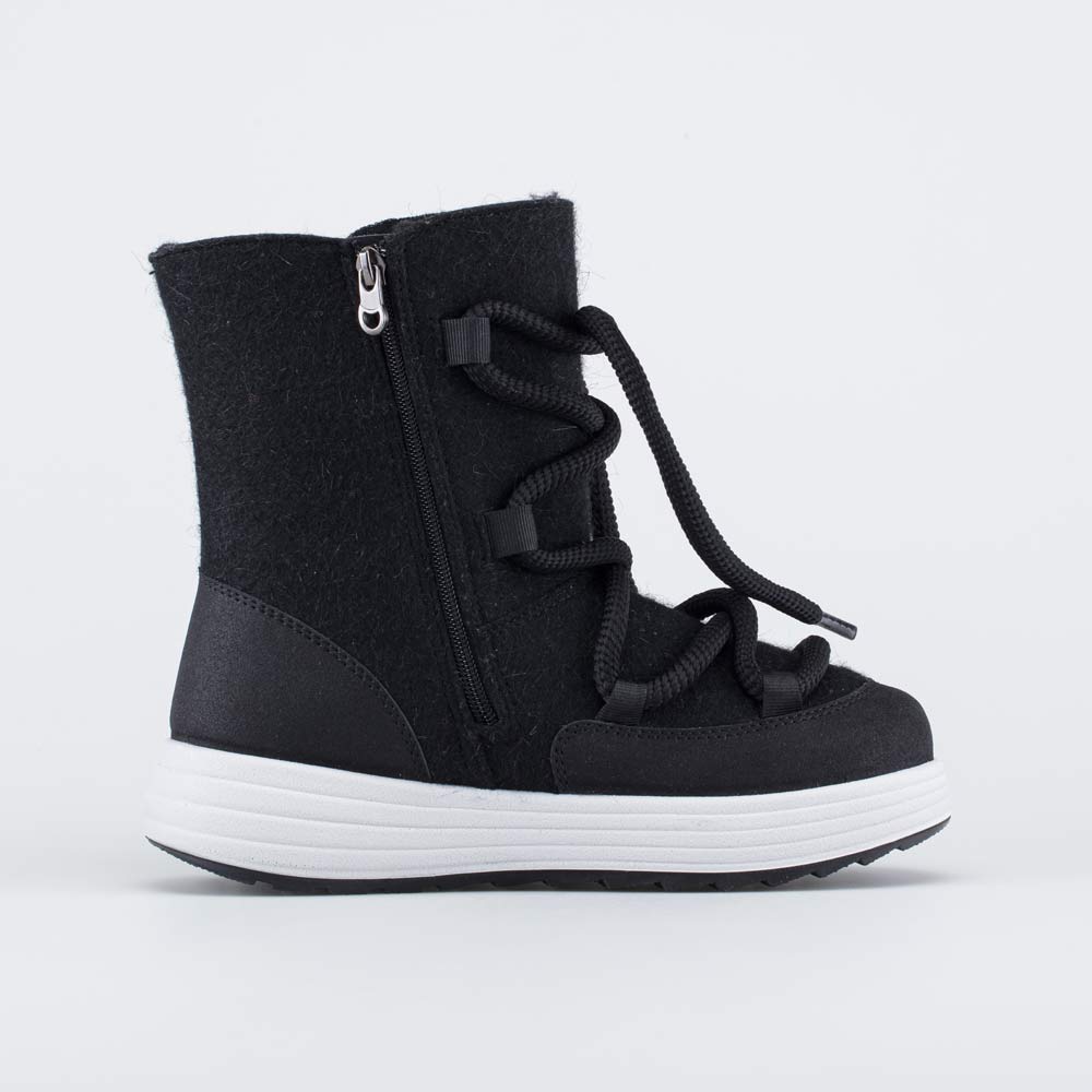 Теплые черные валенки, стилизованные под полусапожки, подходят для девочки. Массивная фронтальная шнуровка придает модели современный вид.